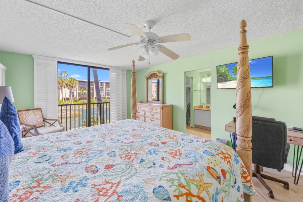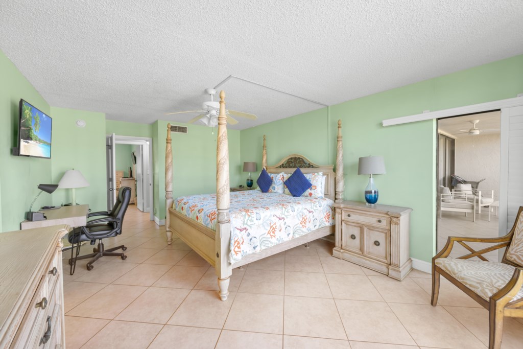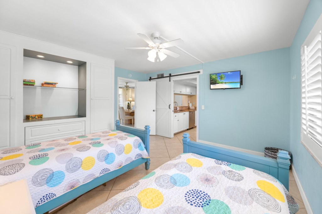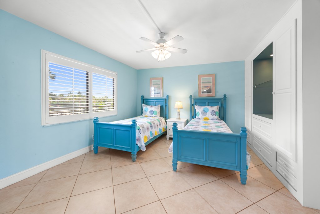 The master suite features a king bed and peaceful Gulf views, while the first guest bedroom has a queen and twin, and the second guest bedroom has two twins, perfect for families or groups.