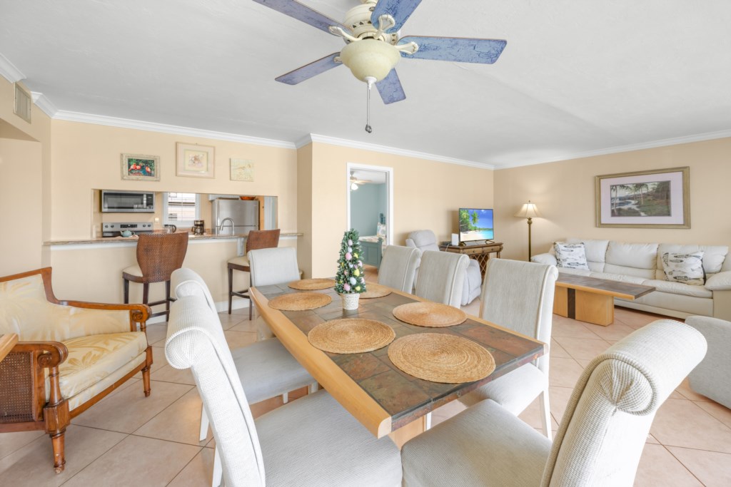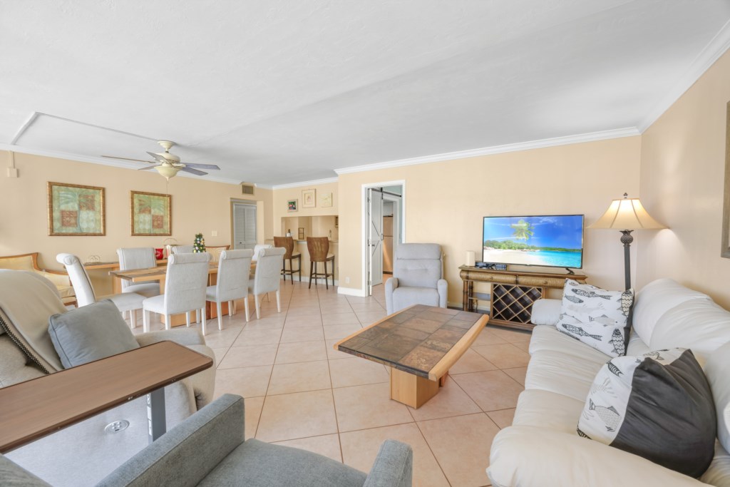 Inside, the open living space flows seamlessly into the updated kitchen and dining area, making it easy to prepare meals while staying connected with family or friends. Relax on the comfortable seating while watching your favorite shows on the flat-screen TV, or gather around the dining table for a shared meal.