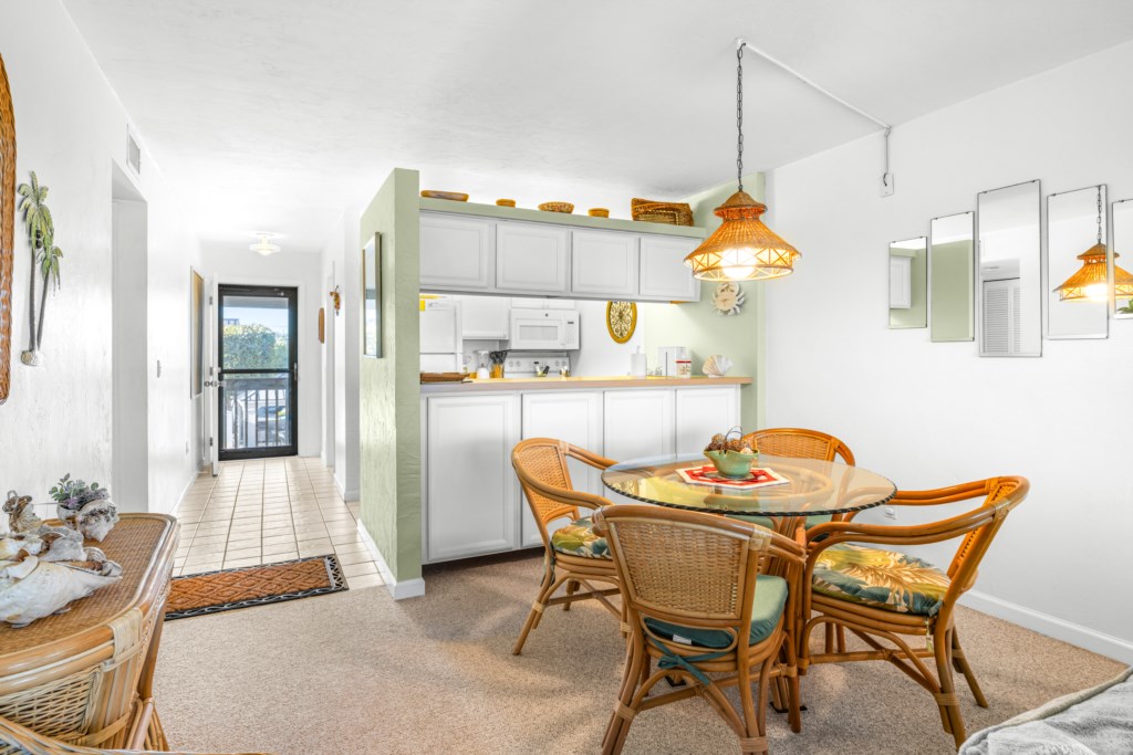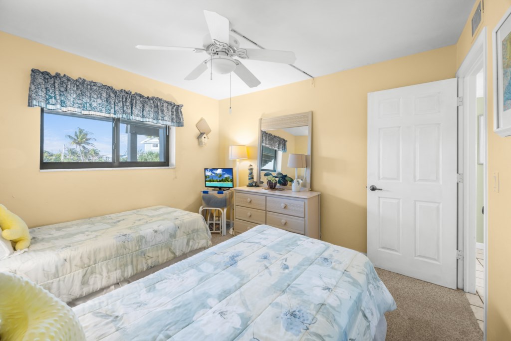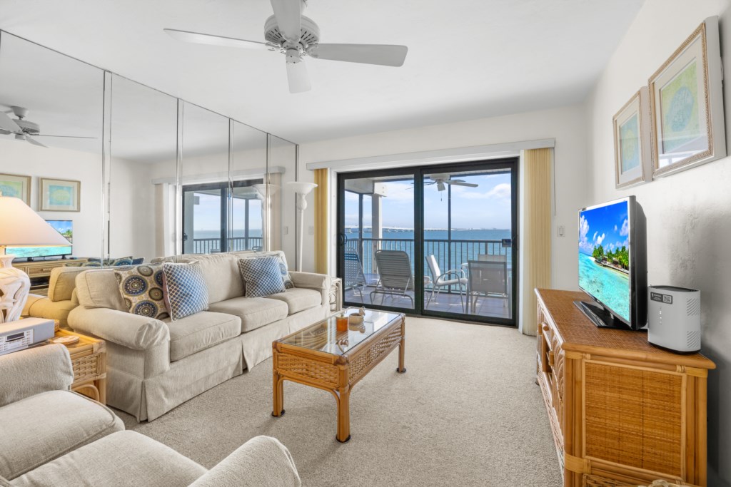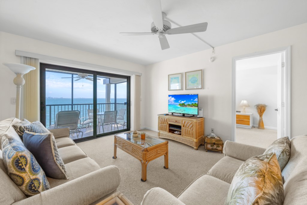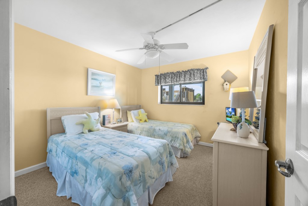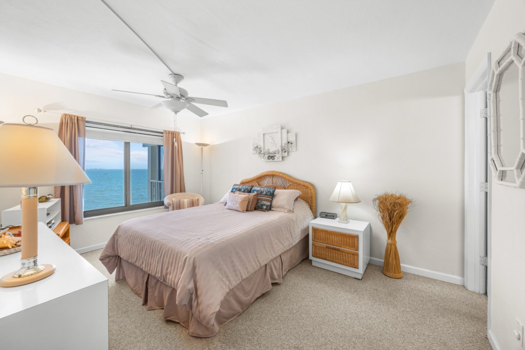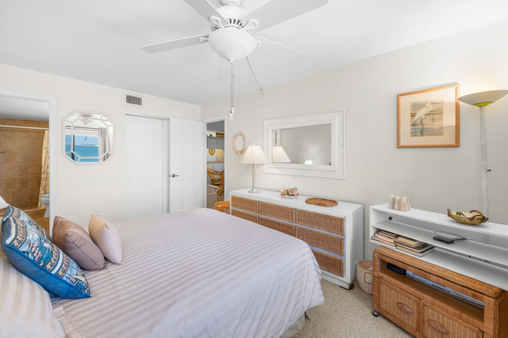 Inside, this second-floor escape is bright, airy, and designed for easy coastal living. The open floor plan invites connection, whether you’re gathering around the indoor dining table or enjoying meals al fresco with a warm breeze. The living room is cozy and welcoming, with a flat-screen TV, pull-out sofa, and stunning bay views that never get old. The master suite offers a peaceful retreat with a queen bed, water views, and a beautifully updated bathroom featuring a walk-in tiled shower. A cheerful guest bedroom and bath ensure comfort for family and friends.