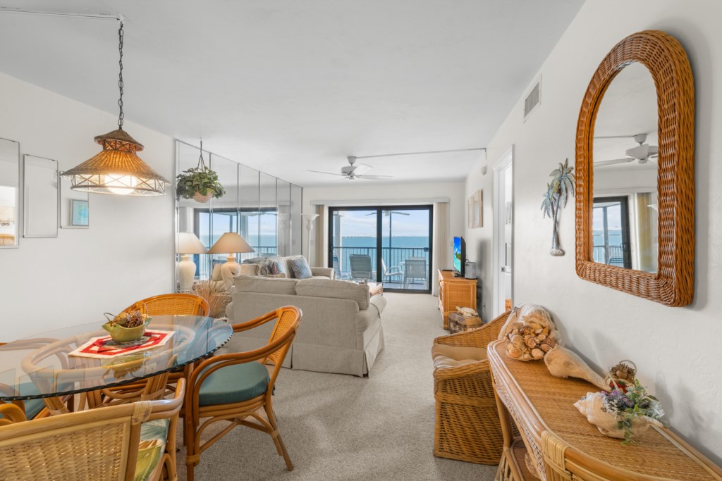 This coastal retreat captures the magic of Sanibel Island from the moment you step inside. Panoramic water views stretch across the horizon as you unwind on the comfortable screened lanai, where the rhythm of the bay becomes your backdrop. From nearly every room—kitchen, dining area, living room, master suite, and even the entry—you’re surrounded by shimmering water, swaying palms, and unforgettable wildlife. Watch pelicans glide effortlessly overhead, dolphins play just feet from shore, and boats drift by as the sky melts into sunset.