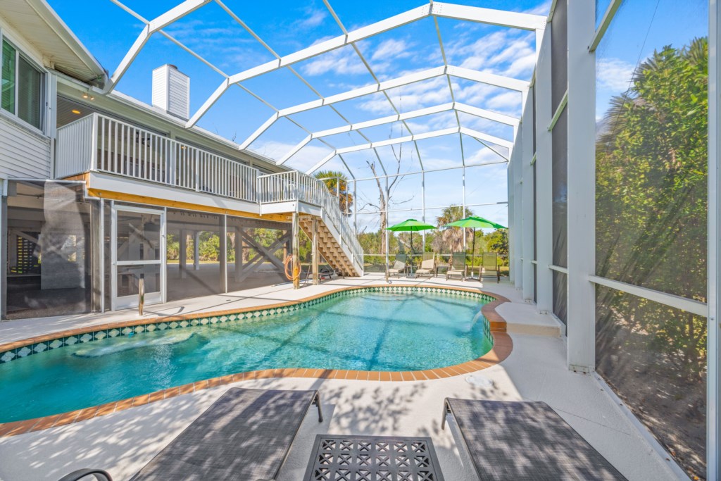 Enjoy the Sanibel wildlife and the peaceful quiet of this four-bedroom four four-bath pool home. Backed up to a wildlife preserve this home is a short walk to the beautiful white sandy beaches of West Gulf Dr. Spend your days looking for shells or relaxing by the heated pool screened by a two-story pool cage featuring a tranquil waterfall. The open floor plan invites you to sit back and relax in the large living room with a large flat-screen TV with streaming video, a dining room, and a fully equipped kitchen with stainless steel appliances. The first bedroom opens up to the deck and has a king-sized bed and a large bathroom with a bath and shower. The first guest bedroom has a queen-sized bed and ample closet space. The second guest bedroom has two twin beds and a walk-in closet. The master bedroom has a king-sized bed, a walk-in closet, and a large bathroom. The expansive deck overlooks the tranquil pool. Covered parking and a large yard give you everything you would want for a Sanibel vacation. Kingfisher Vacations will only book reservations up to 51 weeks in advance. All our properties have contact-free check-in, no need to stop at the office (or a stop light none of those here)! 005353
