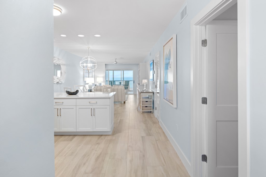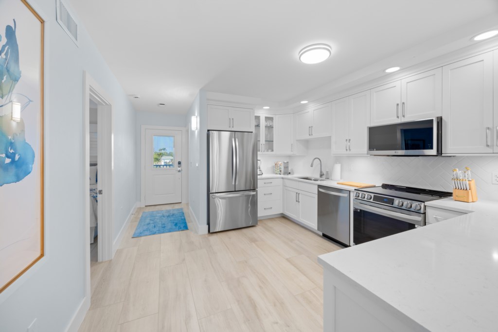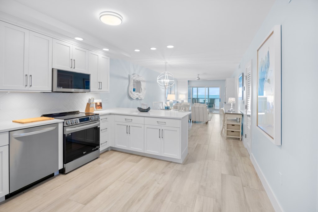 This beautifully updated two-bedroom, two-bathroom Gulf-front condo offers stunning water views and the perfect backdrop for a classic Sanibel beach getaway. Step into the bright, modern kitchen featuring granite countertops, stainless steel appliances, and crisp white cabinetry. Prepare meals while guests relax at the spacious breakfast bar with seating for three. The open dining area provides seating for four at a glass-top wicker table, ideal for relaxed island dining.