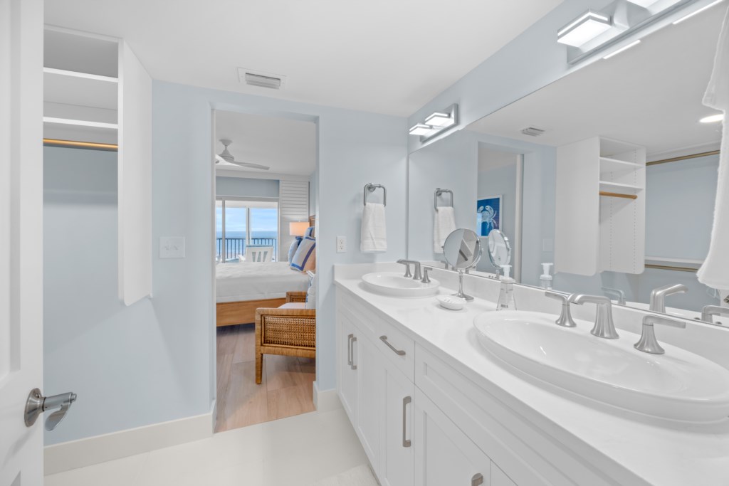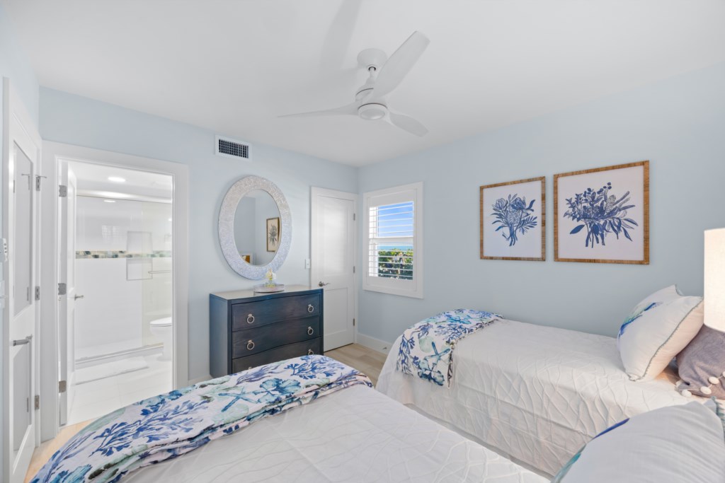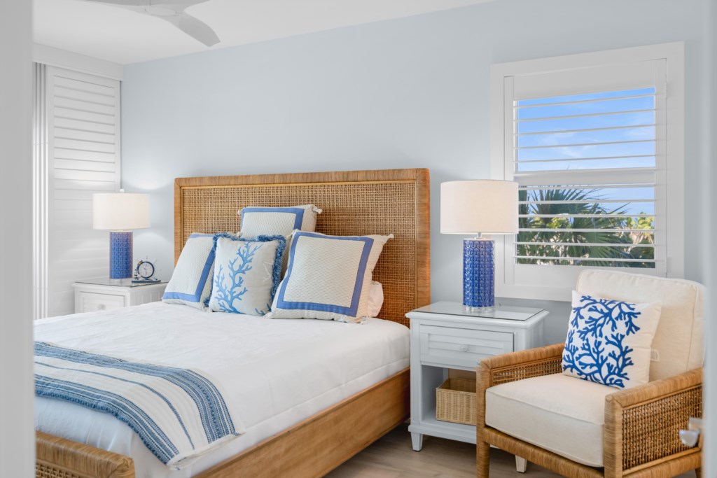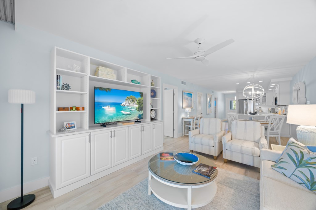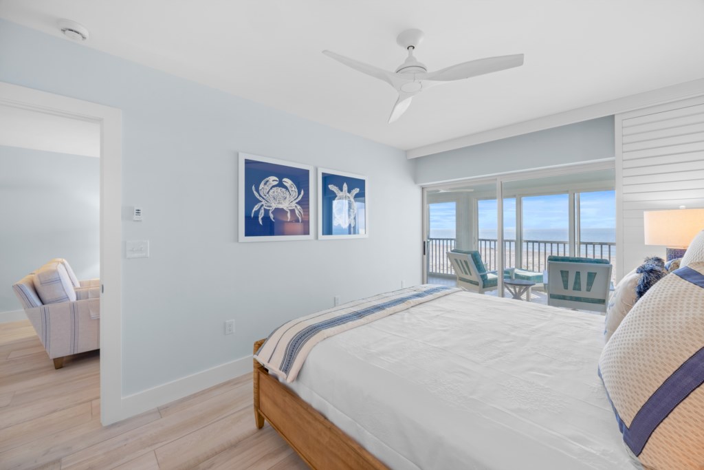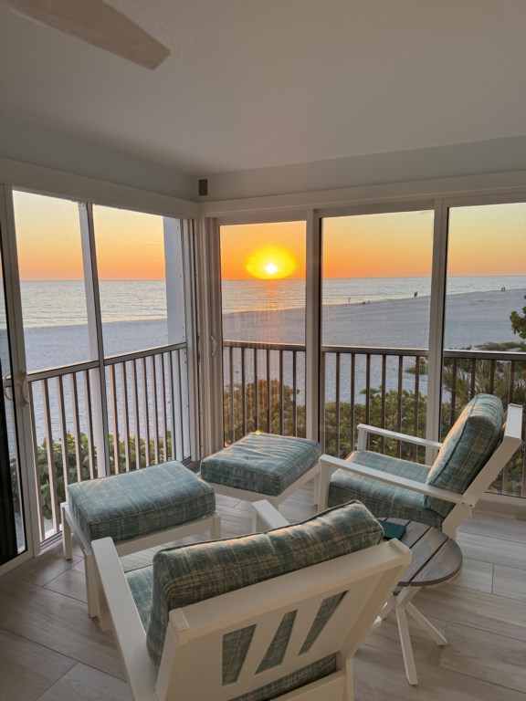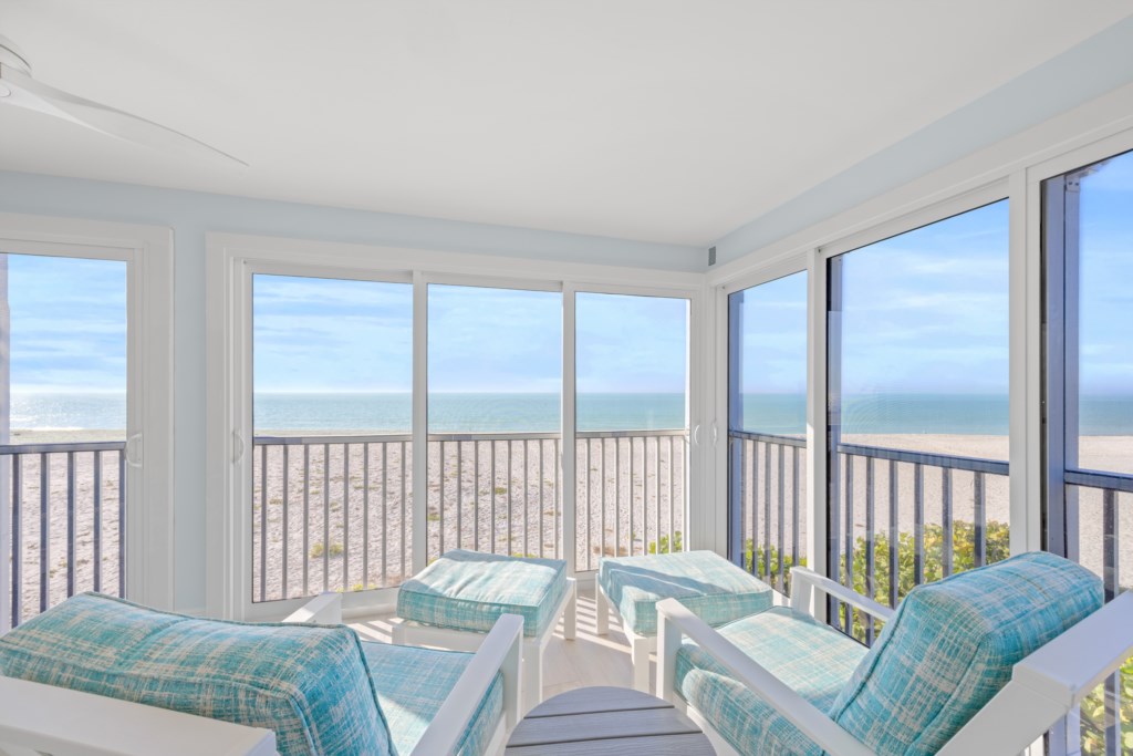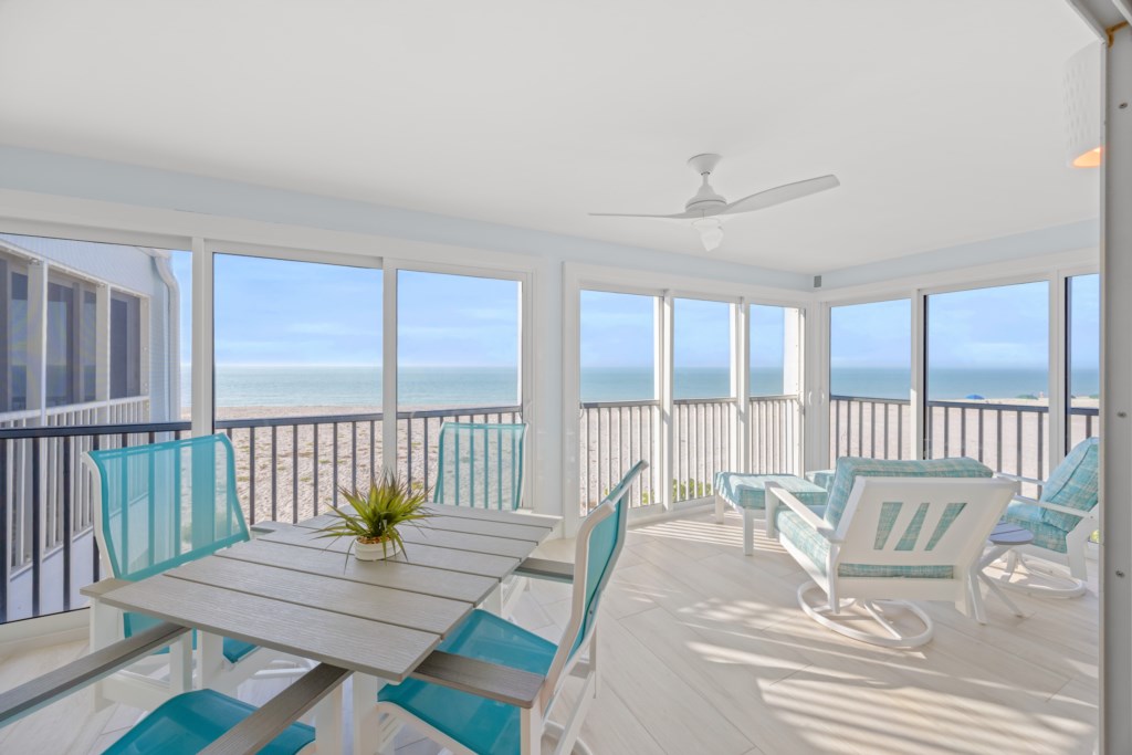 The comfortable living room includes a flat-screen TV and direct Gulf views. Step out onto the expansive screened lanai to enjoy the breeze, watch the waves, read a favorite book, or take in Sanibel’s world-famous sunsets and frequent dolphin sightings.