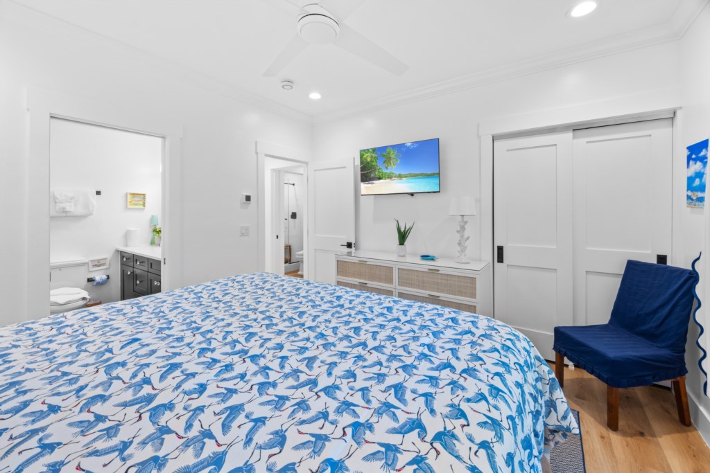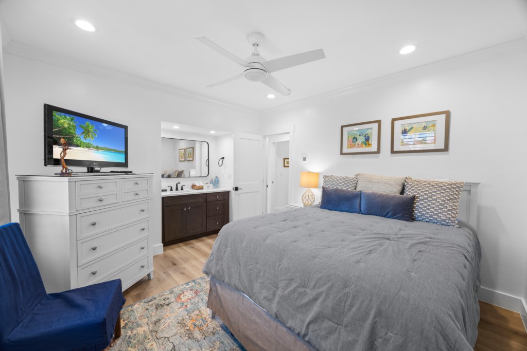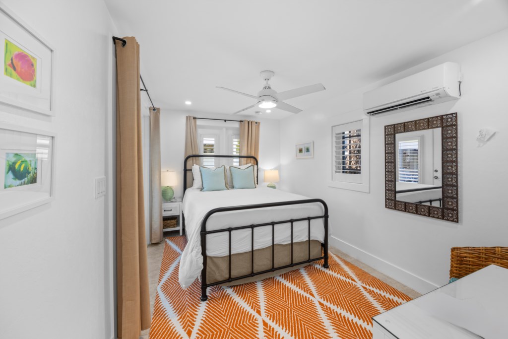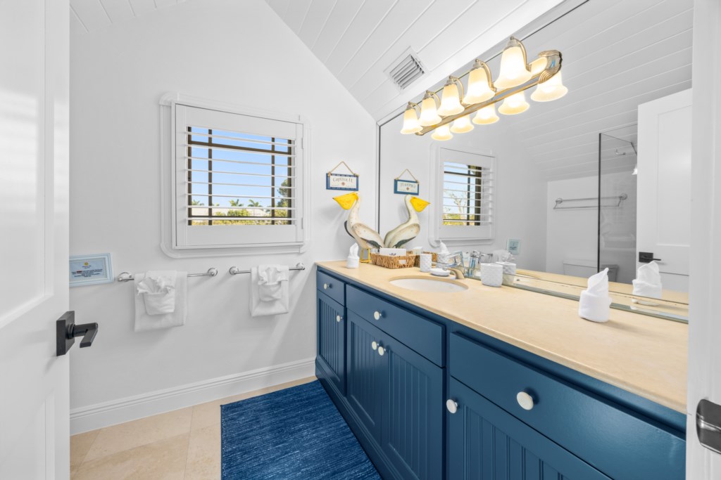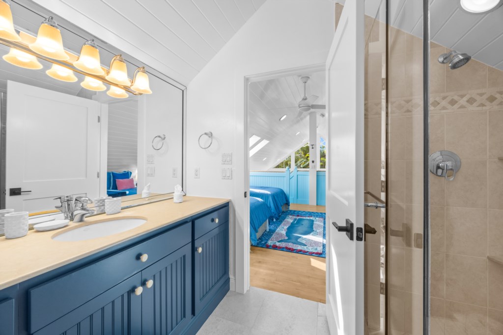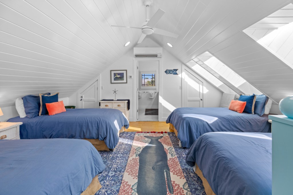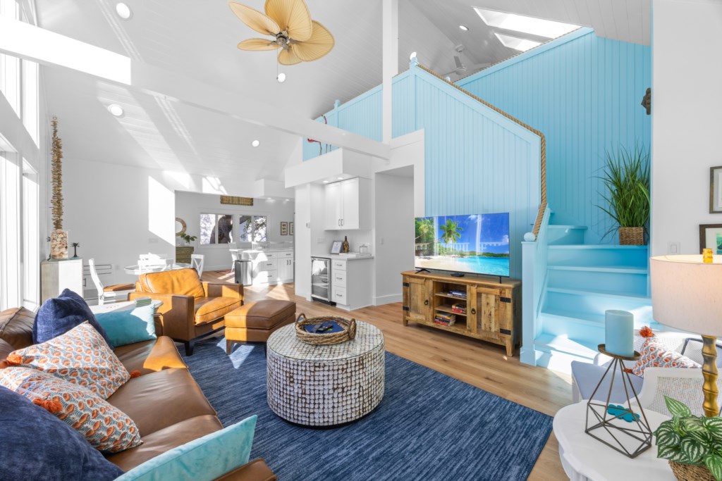 Inside, a professionally decorated beach-chic interior greets you with soaring ceilings, floor-to-ceiling windows, and an open-concept layout perfect for gathering. The living room is bright and welcoming, featuring tropical views, a flat-screen TV, and comfortable seating for the whole group. The updated kitchen boasts granite countertops, tumbled tile backsplash, custom cabinetry, and top-tier appliances. A spacious breakfast bar and two dining areas—one for six and another perfect for game night—make it easy to enjoy meals together. The main level master bedroom features a rattan-accented king bed, pool views, and an en-suite bath with a glass walk-in shower and granite-topped vanity. Also on the main level is a cozy queen bedroom with its flat-screen TV and a nearby full guest bath with a tiled shower. Upstairs, a large open loft offers four twin beds and skylights, plus an attached full bathroom—perfect for kids or teens. The elevated wall provides privacy while keeping the space airy and connected. A separate Cabana Suite across from the pool offers additional privacy, with a queen bed, flat-screen TV, individual A/C, and a private bath featuring a spacious tiled shower.