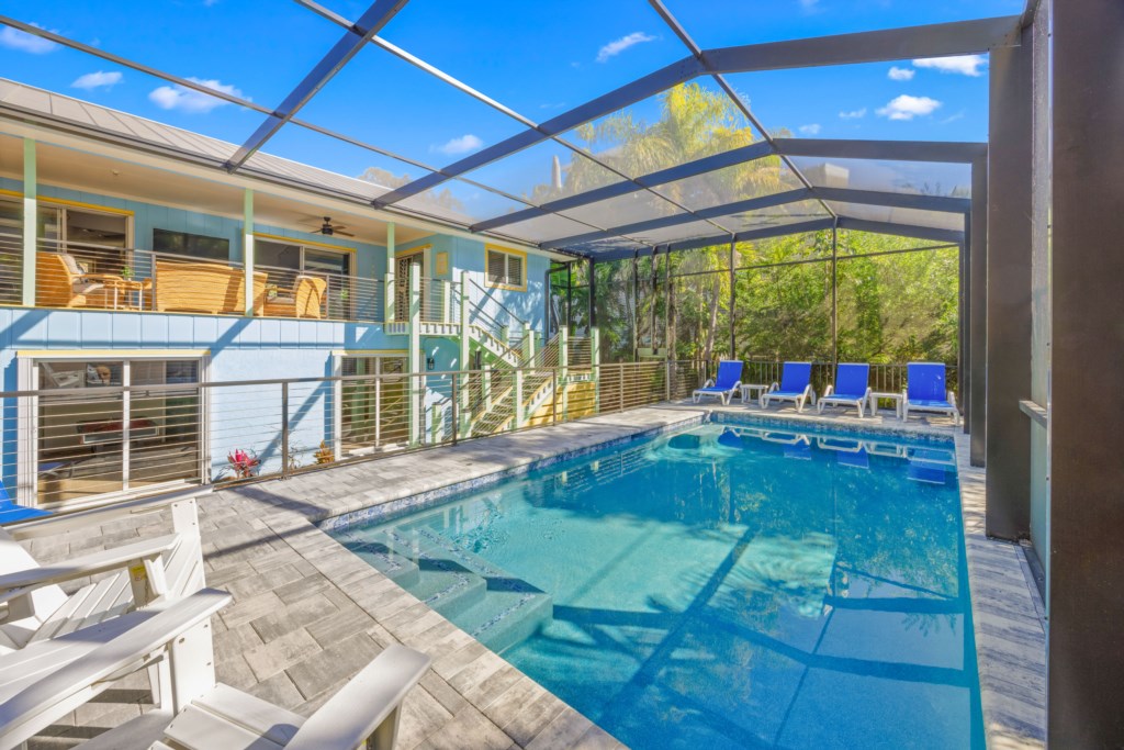 Dancing Dolphin is your perfect Captiva Island vacation rental, nestled in the heart of Captiva Village. As you pull into the driveway, you’re greeted by the home’s namesake—a fun-loving dolphin in sunglasses that sets the tone for your laid-back island getaway. Just a short stroll to the beach, bay, restaurants, shops, and marinas, this colorful beach house has everything you need for an unforgettable escape. With a private outdoor elevator and stairs for easy access to the second-floor living space, getting in and out is a breeze. Punch in your code, turn the knob, and step into a spacious, sunny open-concept living area with soaringceilings and two cozy sitting zones. One is anchored by a wall of bookshelves, and the other by a comfy L-shaped section—ideal for movie nights or lazy afternoons. Off the main space, the Sea Turtle Bedroom features a king-size bed and charming coastal touches. Directly across is the Manatee Bedroom, decorated in soothing blue stripes with two low-profile twin beds—great for kids but worth noting for guests with mobility concerns. This bedroom opens up to the screened lanai, outfitted with seating for six, an outdoor table, a wall-mounted TV, and two swinging hammock chairs—your new favorite place for morning coffee or evening wine. The hallway bath is bright and cheerful with a playful “fishy” theme, and a nearby closet holds basic cleaning supplies (though we hope you won’t need them). The fully equipped kitchen makes dining a breeze. Everything is labeled and ready for you: a four-slot toaster, airfryer, blender, Keurig and drip coffee makers, and all the cookware you need. Gather around the dining table, which seats eight, for family meals, game nights, or fresh-caught seafood feasts. Seashell, the Master Suite offers a king-size bed, access to the lanai, and a private en-suite bath with everything you need to unwind after a day in the sun. Downstairs, the fun continues. The game room features a foosball table, pool/ping pong table, flat-screen TV, futon, and walls lined with vintage movie posters—a total hit with teens and nostalgic adults alike. A full bathroom with a