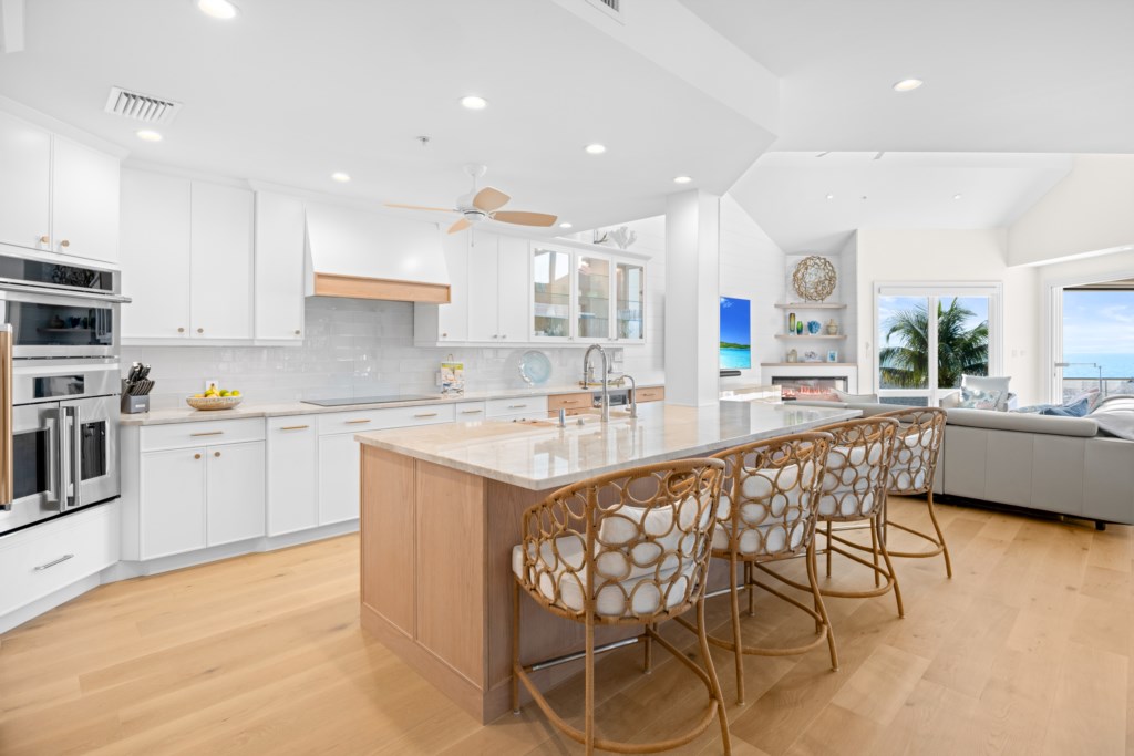 Just off the living room, the gourmet kitchen is designed for both beauty and function. Natural stone countertops, premium appliances, crisp cabinetry, and a generous island make it ideal for preparing meals, gathering with family, or lingering over morning coffee and evening cocktails.