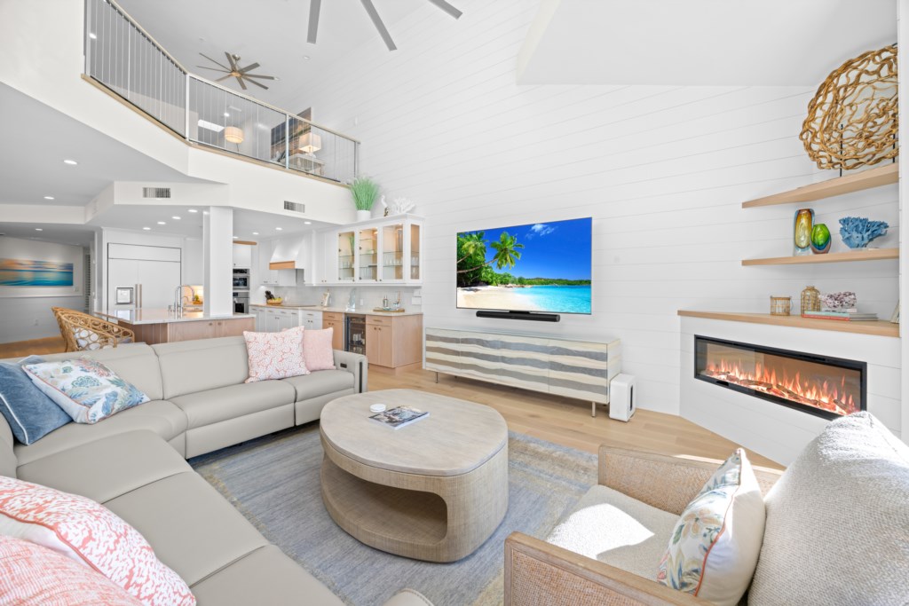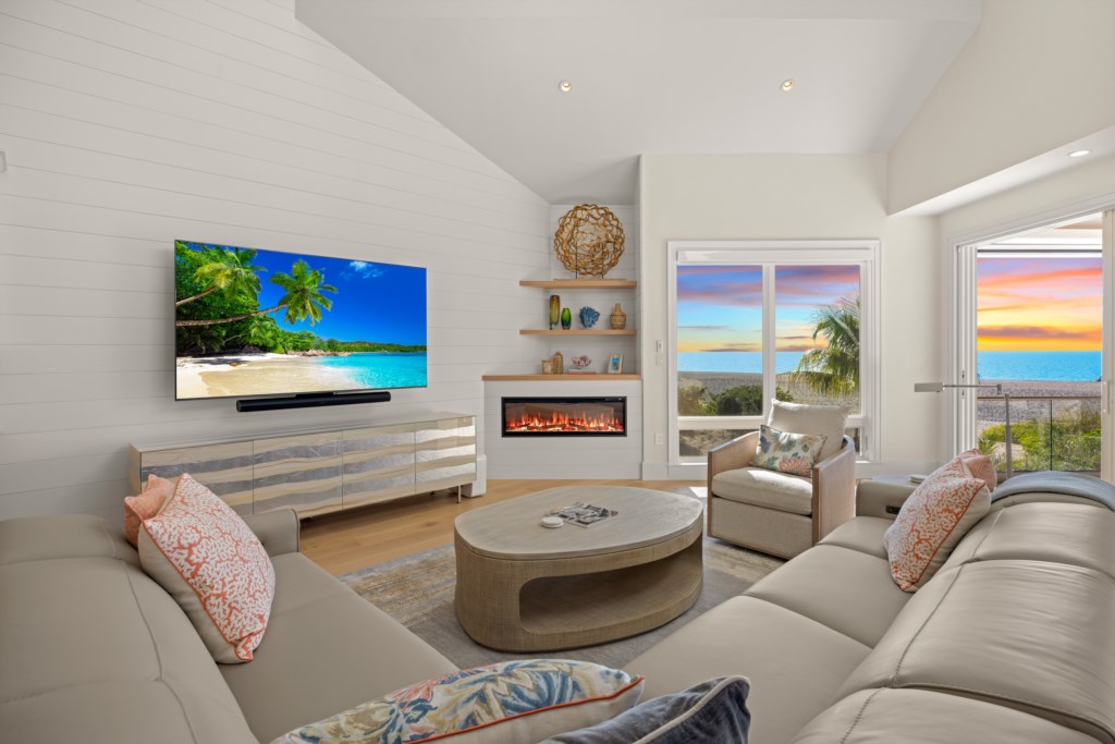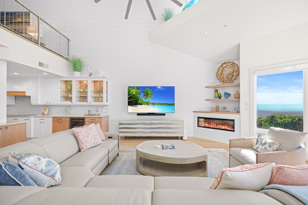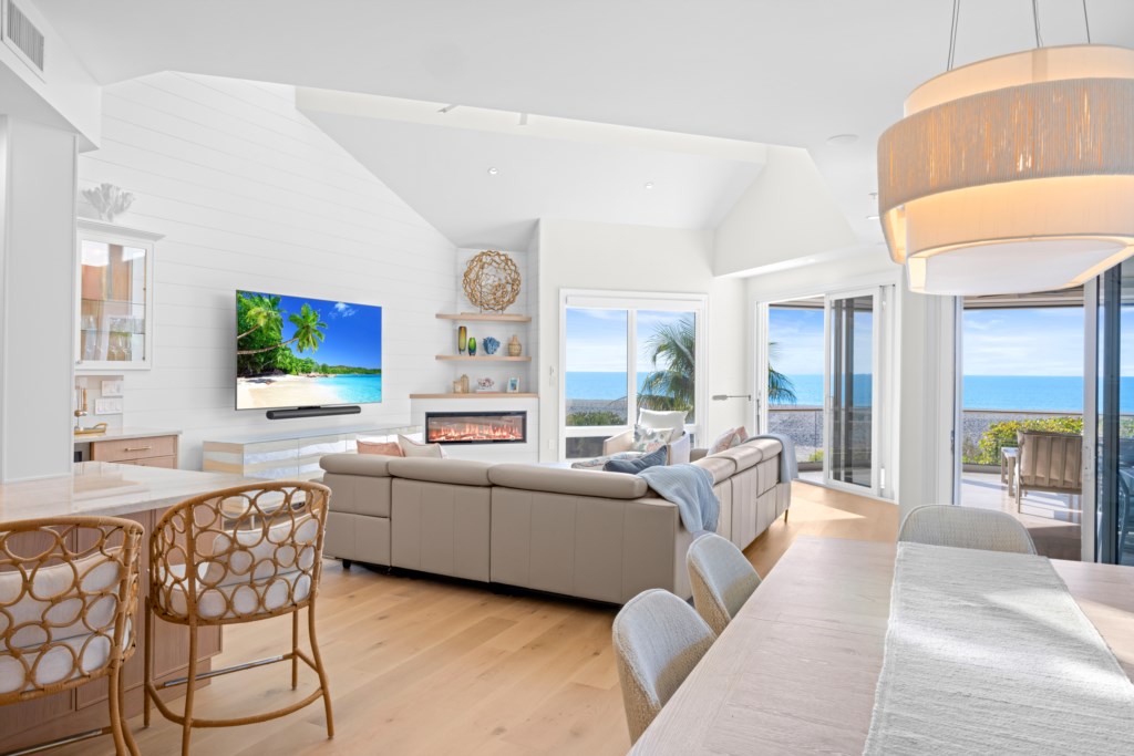 The main living area opens to sweeping views of the turquoise Gulf through walls of glass. A large leather sectional with three built-in power recliners anchors the space, inviting you to relax while watching the waves roll in. A driftwood-toned coffee table, textured area rug, and electric fireplace add warmth and elegance, creating an atmosphere that is both refined and comfortable.
