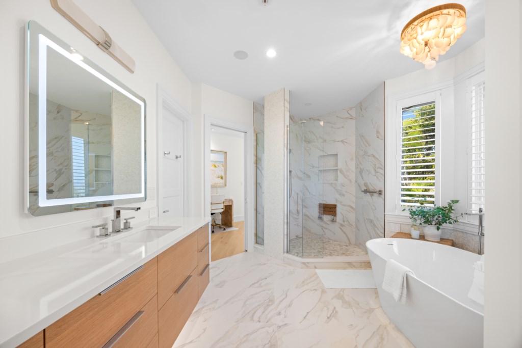 The primary master suite is located on the upper level, offering privacy and elevated views. This spacious retreat features a king bed, a luxurious ensuite bathroom with quartz countertops and a separate soaking tub, and a large private lanai surrounded by tropical scenery—ideal for morning coffee or evening relaxation.