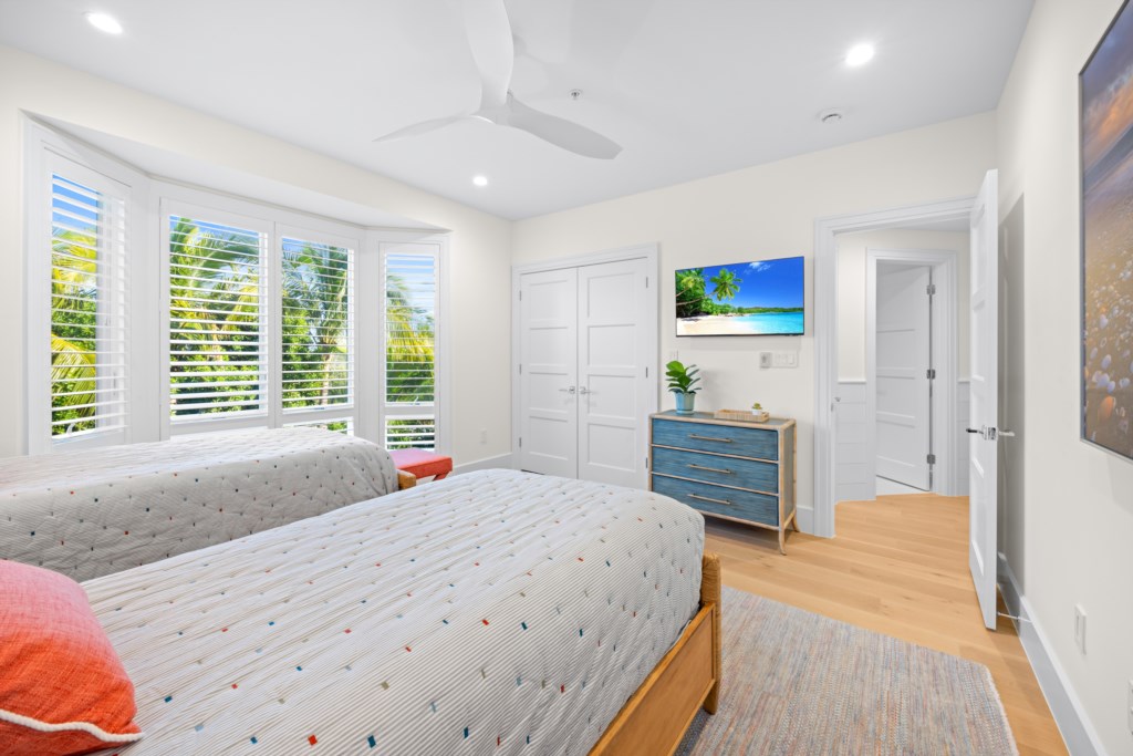 The fourth bedroom on the main level includes two twin beds that can be professionally converted into a king using a high-quality conversion kit. This bedroom uses the shared hallway bathroom.