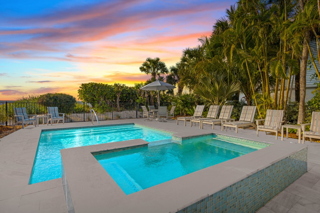 An elevated hot tub spills gently into the pool, offering a soothing place to unwind after a day at the beach. Upper-level balconies with glass railings overlook the pool, tropical grounds, and the Gulf beyond, creating beautiful vantage points throughout the home.