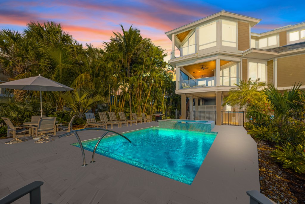 Outside, a private pool is surrounded by lush tropical landscaping and swaying palms, creating a secluded, resort-like setting. Comfortable loungers line the pool deck, while a shaded dining area provides space for outdoor meals and breaks from the sun.