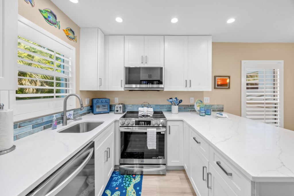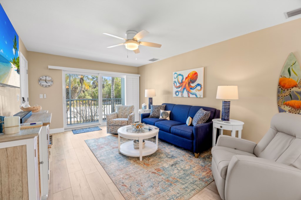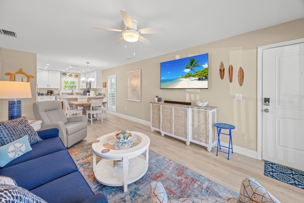 Step into the spacious living room, where plush seating and a 65" smart TV set the scene for cozy movie nights, your favorite sports, or quiet afternoons after a day in the sun. The thoughtfully prepared kitchen is fully stocked with everything you need for quick breakfasts, fresh seafood dinners, or lazy lunches shared with family and friends. Whether you're cooking or simply pouring a sunset cocktail, the space is designed to make life feel uncomplicated and enjoyable.