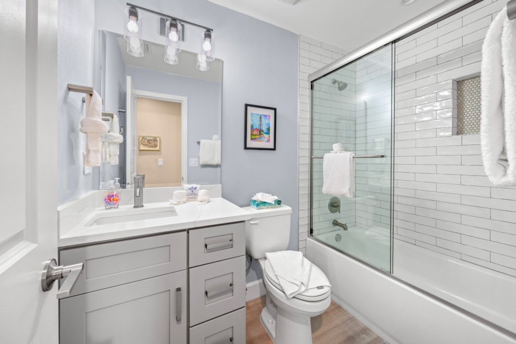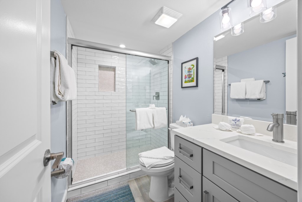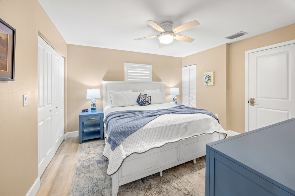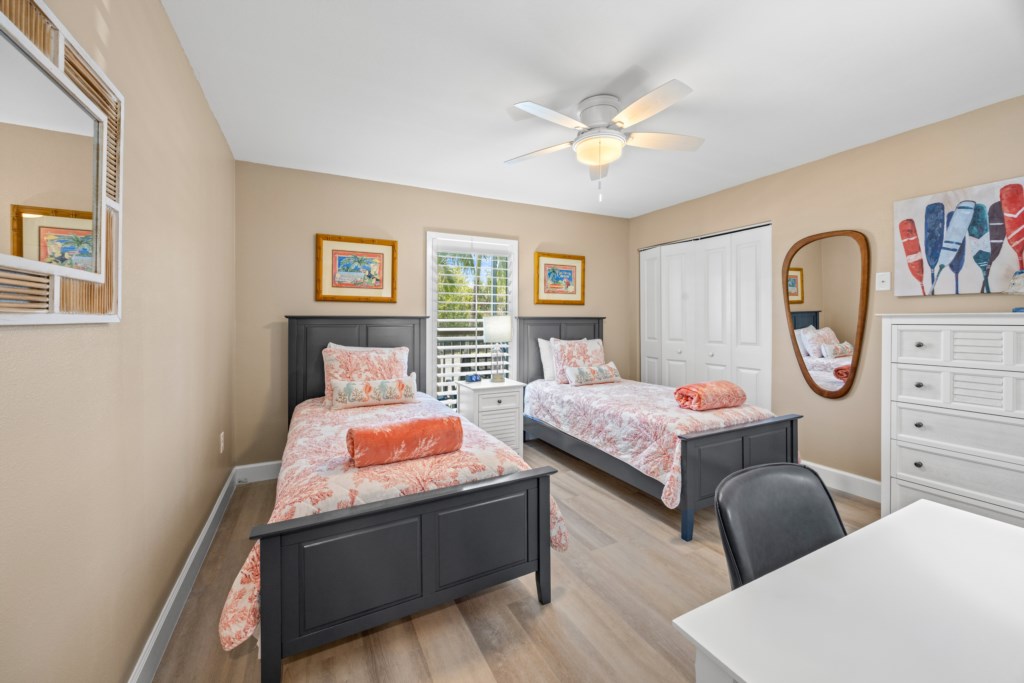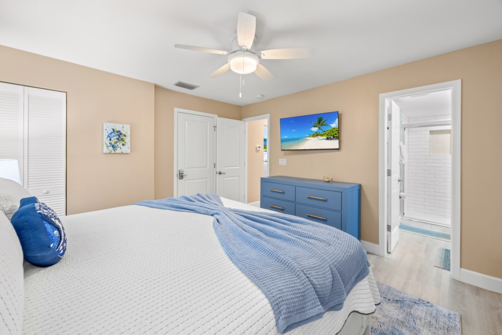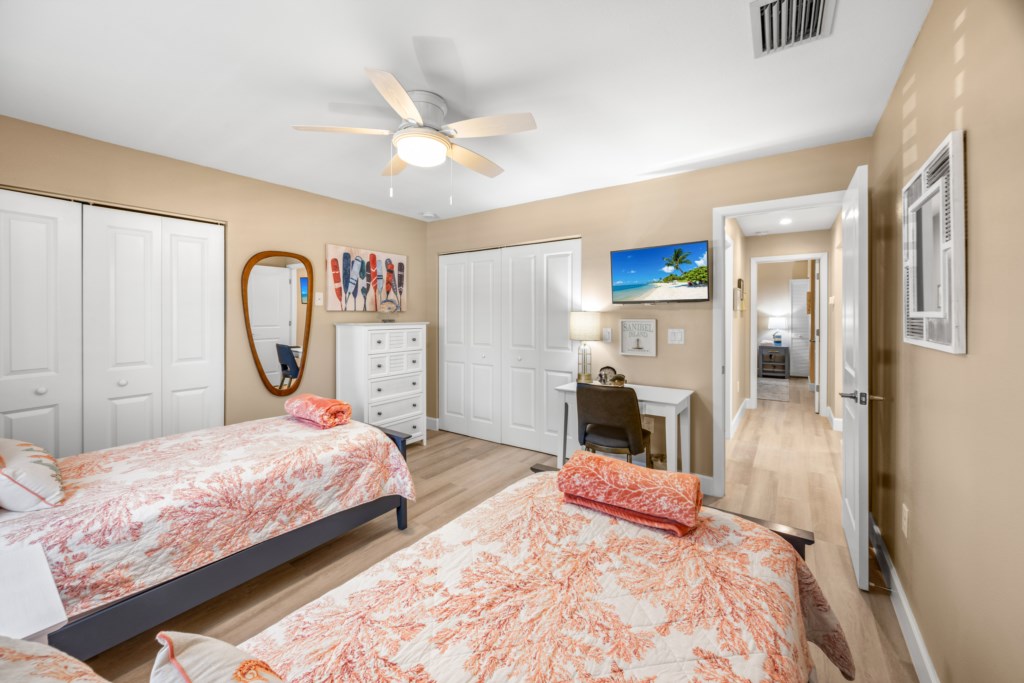 In the primary suite, a king bed and beautifully tiled en suite shower await. The guest bedroom features two twin beds and a dedicated workspace—an ideal setup for families, visiting friends, or remote workdays where you still want to feel close to vacation. Both bedrooms feature smart TVs so everyone can enjoy themselves. An in-unit washer and dryer allows you to pack light and keep beach days carefree.