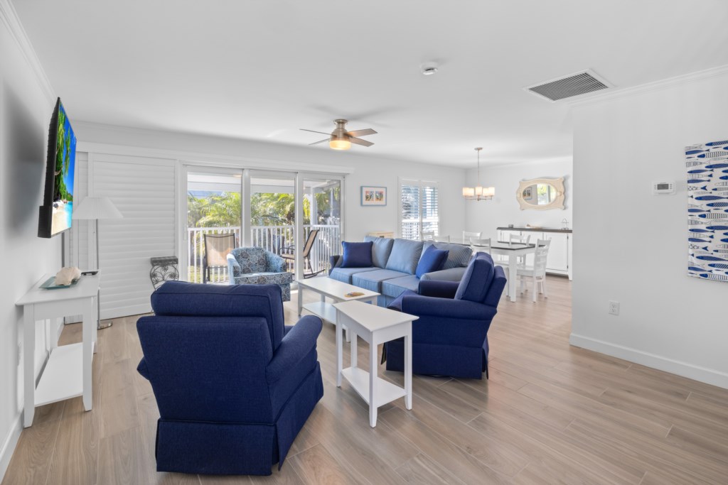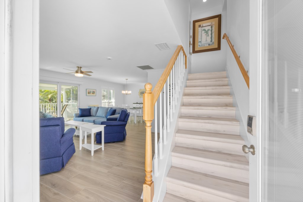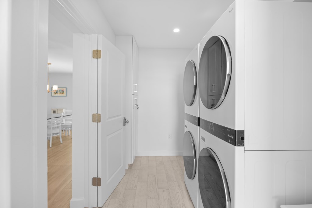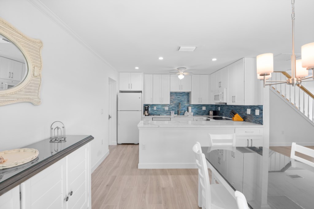 This spacious two-story townhome features coastal-chic décor, all-new furnishings, and laminate flooring throughout. The primary suite includes a king bed and a beautifully updated tiled walk-in shower. The guest bedroom offers a comfortable queen bed and an updated bath with a shower/tub combo. Additional sleeping space is available with a sleeper sofa, and the unit includes a washer and dryer for added convenience.