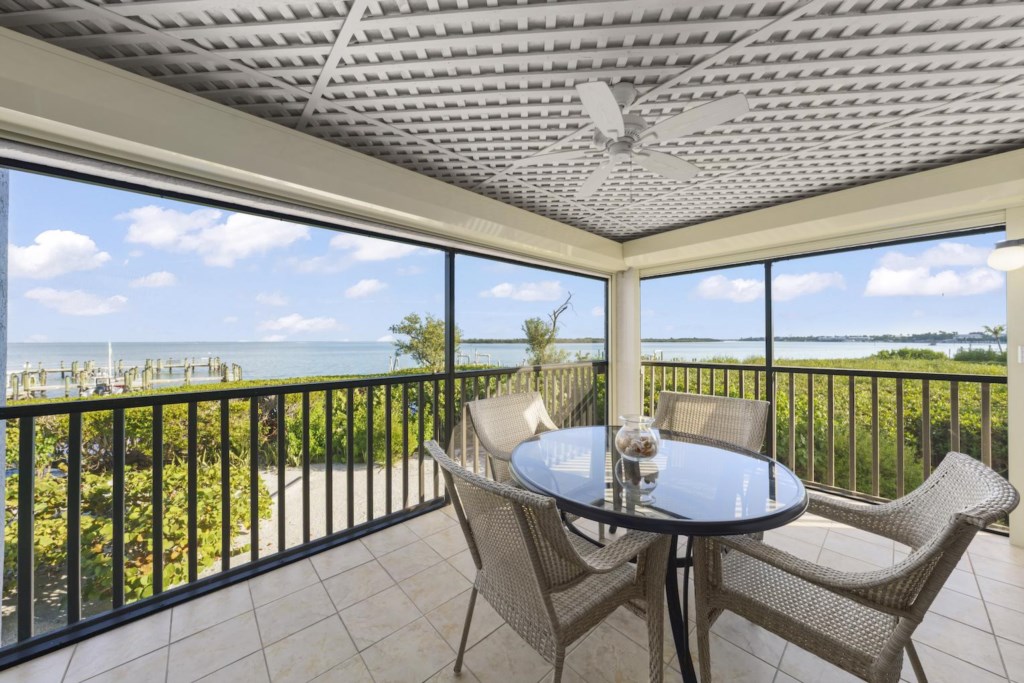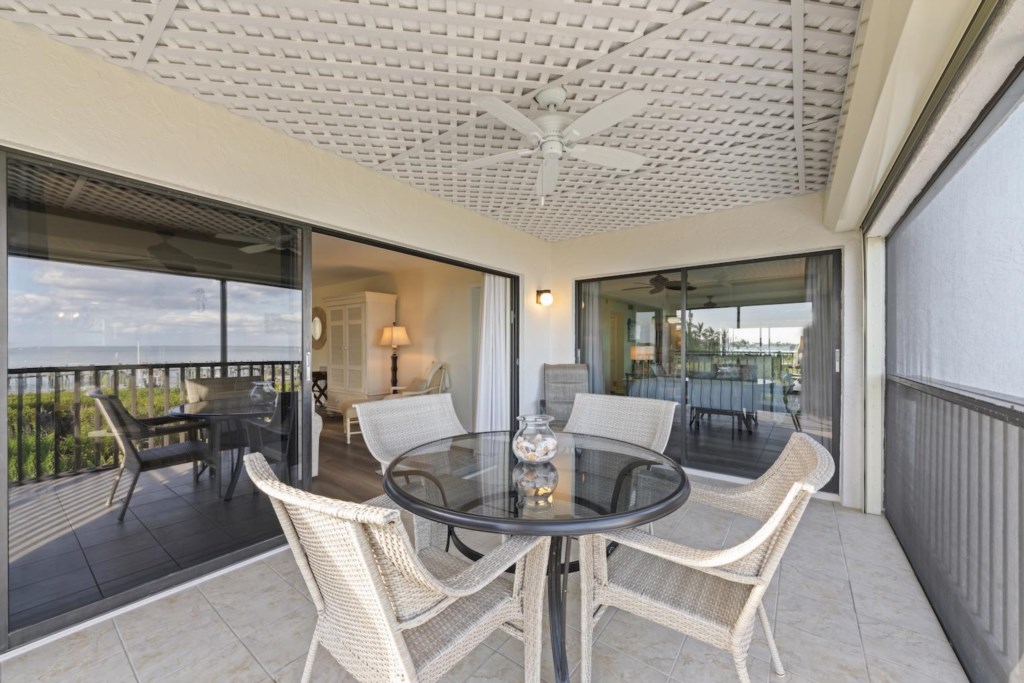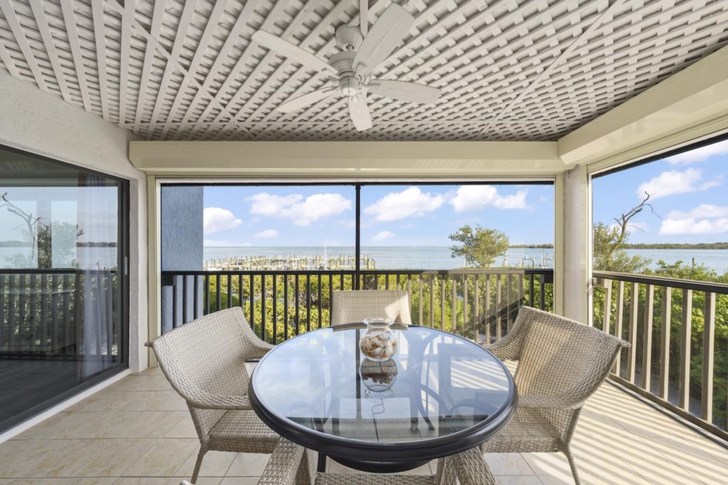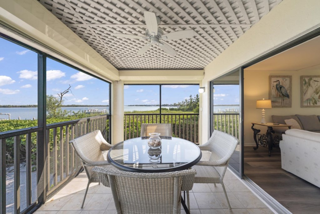 Wake up to the gentle sparkle of Pine Island Sound and end each day with the soft glow of twilight on the water at Sunset Captiva 104. This airy two-bedroom corner condo places you right on the bayside, where dolphins roll in the distance, manatees drift near the docks, pelicans skim the surface, and boats quietly glide by. From your screened lanai, the water feels close enough to touch — a peaceful backdrop to morning coffee or a glass of wine at sunset.