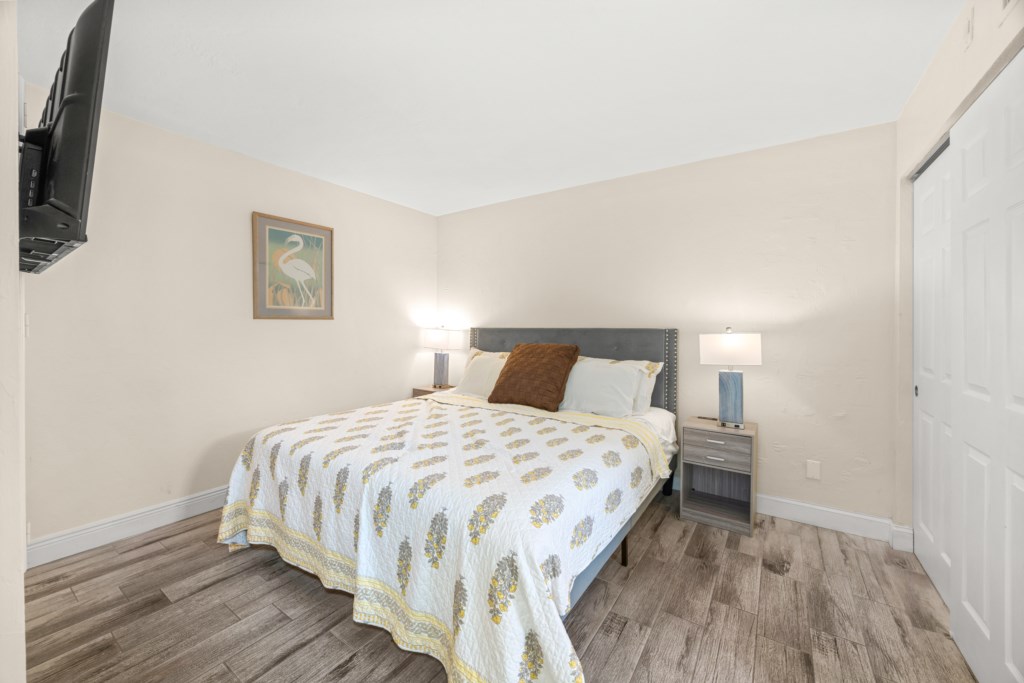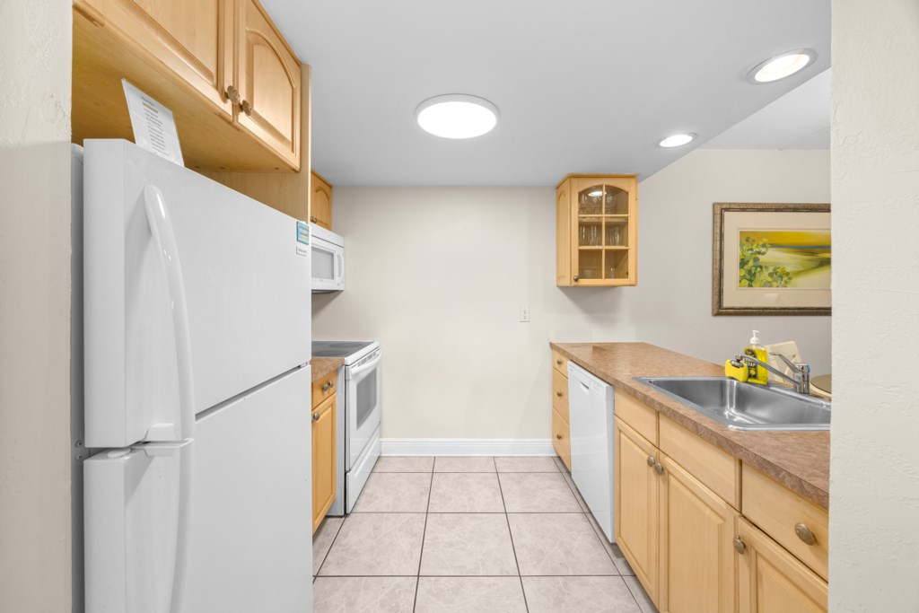 Inside, the condo is clean and functional. The bedroom has a king bed and ceiling fan, the living area includes a queen sofa sleeper, and the kitchen has full-size appliances and basic cookware, though finishes reflect an earlier era. Additional features include two smart TVs, Wi-Fi, tile flooring and elevator access in the building if needed.