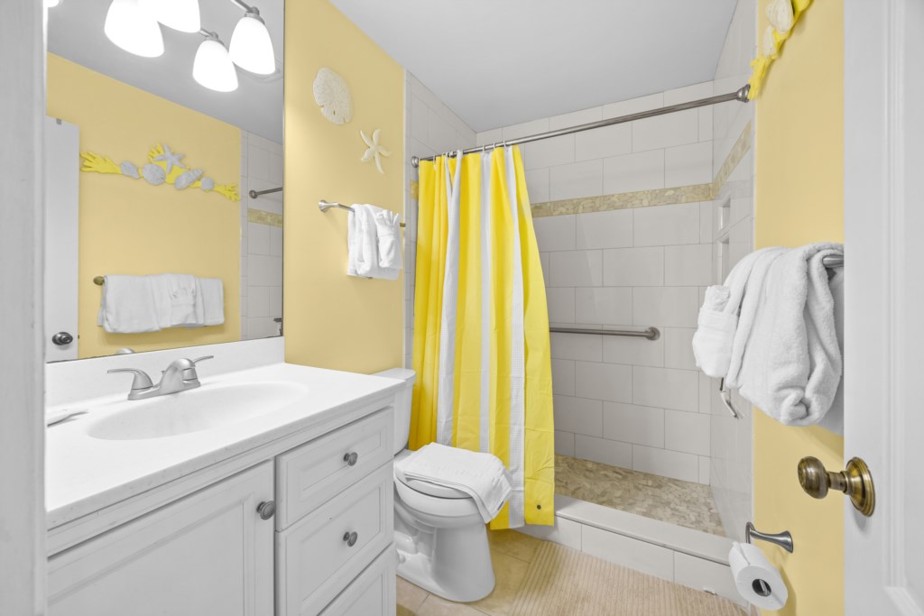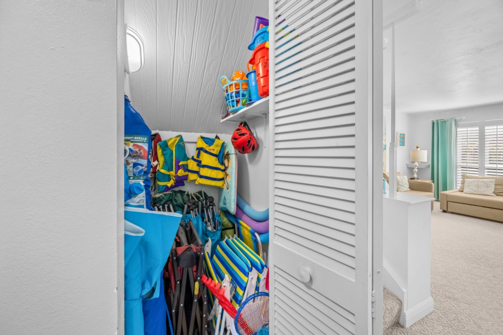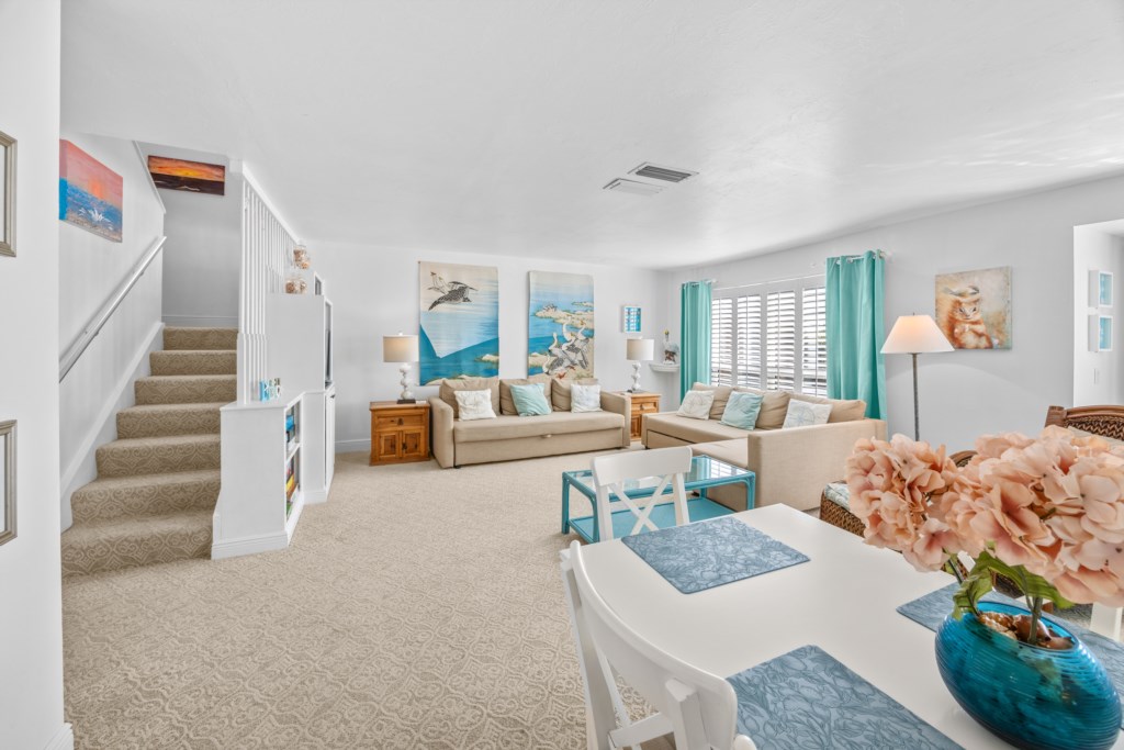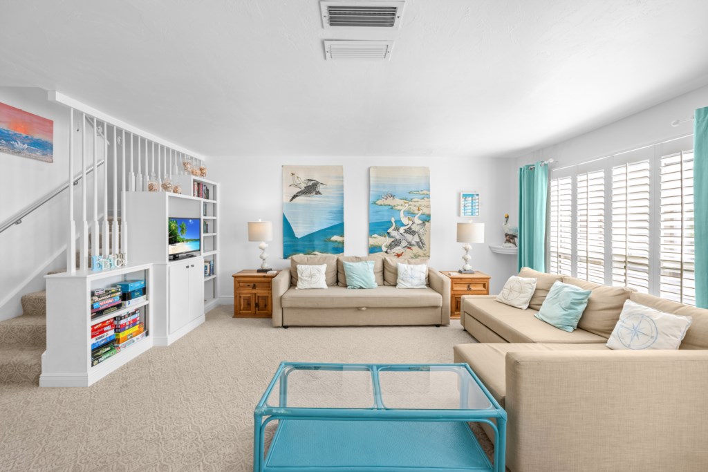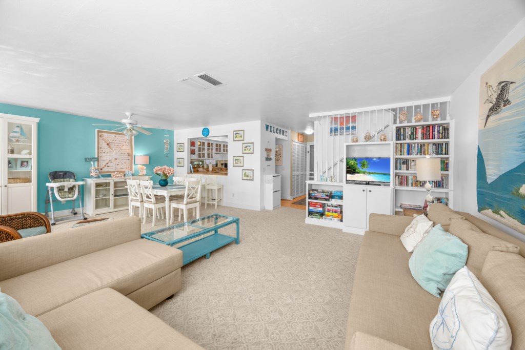 On the first floor, the open living and dining area is sunny and inviting, furnished with updated décor, a flat-screen TV, DVD player, and a generous collection of books and games. Two queen sleeper sofas provide additional sleeping space. The kitchen opens seamlessly to the dining area and breakfast bar with seating for three. It features light wood flooring, ample cabinetry, and is fully equipped for everything from simple breakfasts to full dinners. A stacked washer and dryer are conveniently located on this level, along with a half bath. The downstairs closet is stocked with beach essentials, including a beach cart, chairs, umbrellas, toys, shelling gear, and a cooler.
