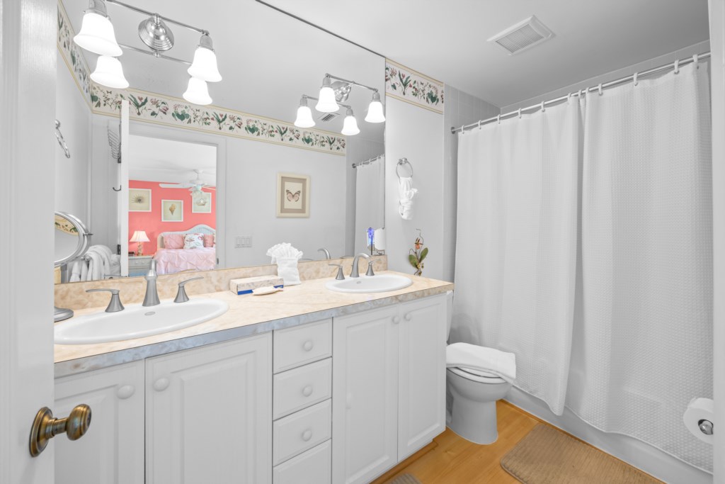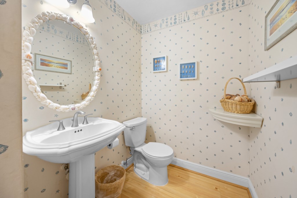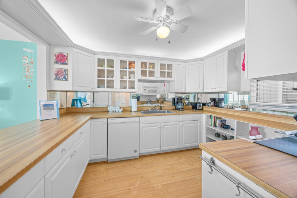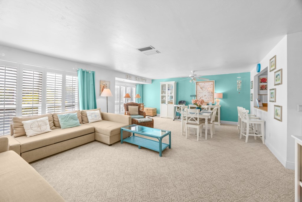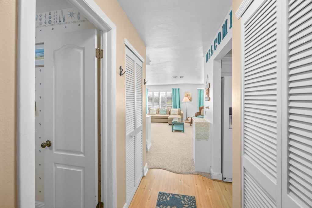 On the first floor, the open living and dining area is sunny and inviting, furnished with updated décor, a flat-screen TV, DVD player, and a generous collection of books and games. Two queen sleeper sofas provide additional sleeping space. The kitchen opens seamlessly to the dining area and breakfast bar with seating for three. It features light wood flooring, ample cabinetry, and is fully equipped for everything from simple breakfasts to full dinners. A stacked washer and dryer are conveniently located on this level, along with a half bath. The downstairs closet is stocked with beach essentials, including a beach cart, chairs, umbrellas, toys, shelling gear, and a cooler.