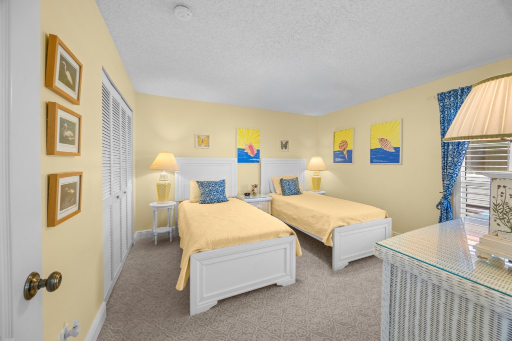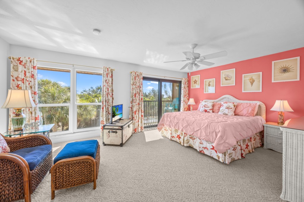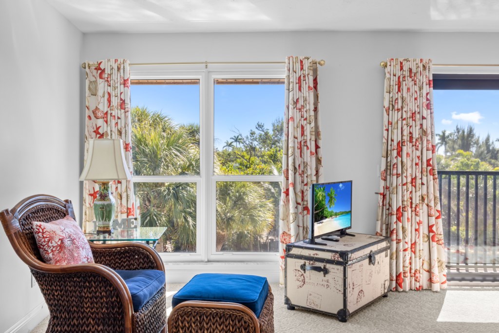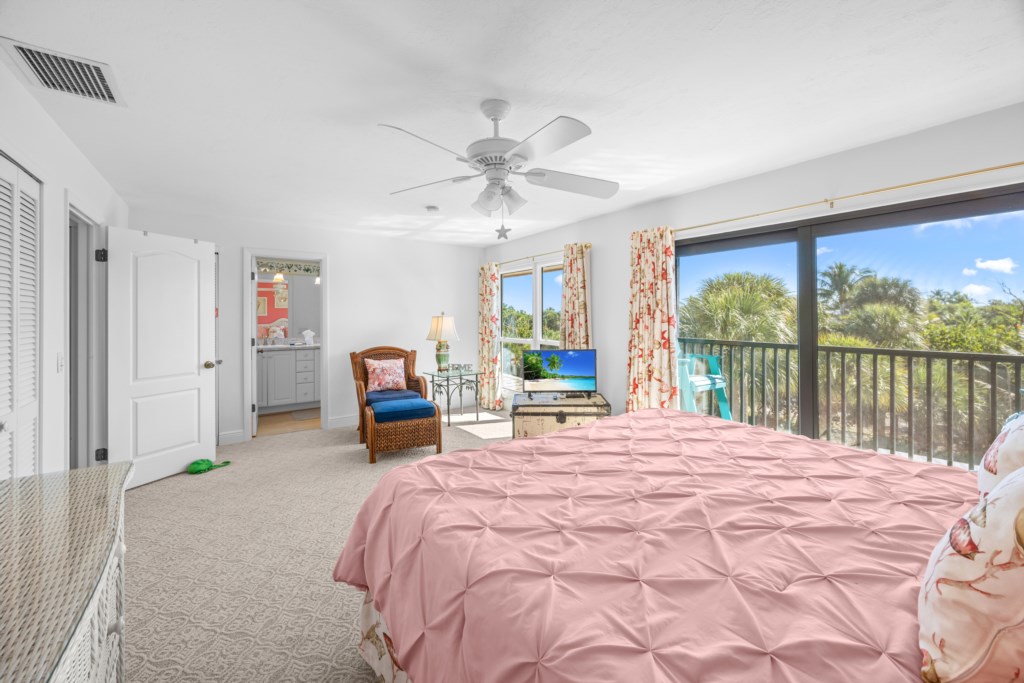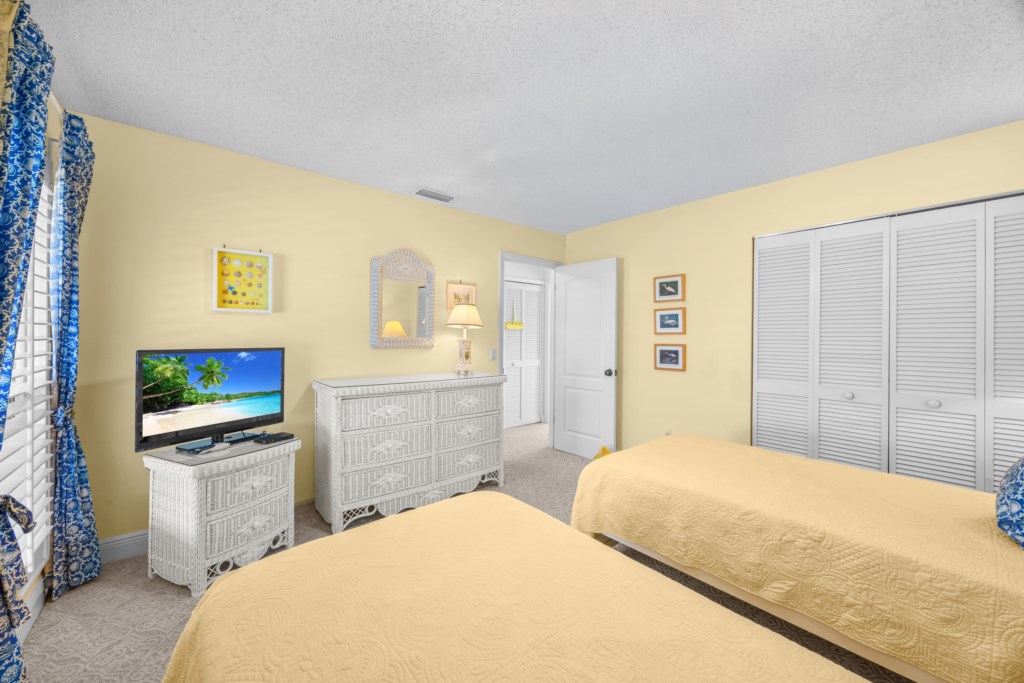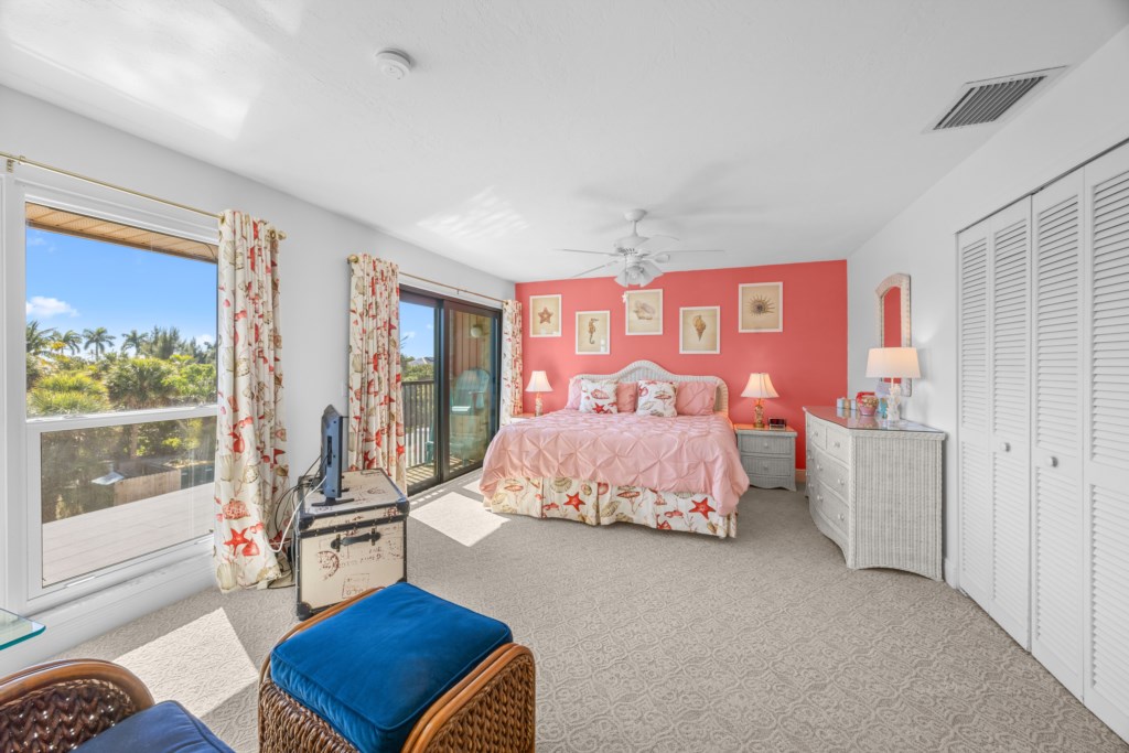Upstairs, the primary suite is a peaceful retreat with a king-size bed, tropical Floridian décor, flat-screen TV, and a spacious private bathroom. Sliding doors open to a screened balcony with a partial Gulf view, where elevated lounge chairs invite you to unwind with an evening drink while enjoying the breeze without no-see-ums. The second bedroom is bright and cheerful, furnished with two twin beds and a TV, and is paired with a beautifully renovated bathroom featuring a large walk-in shower.