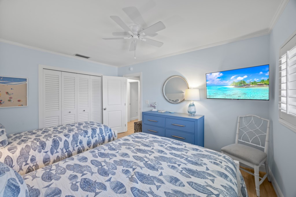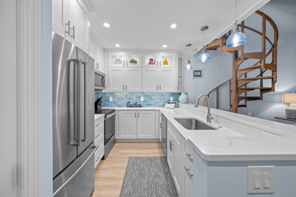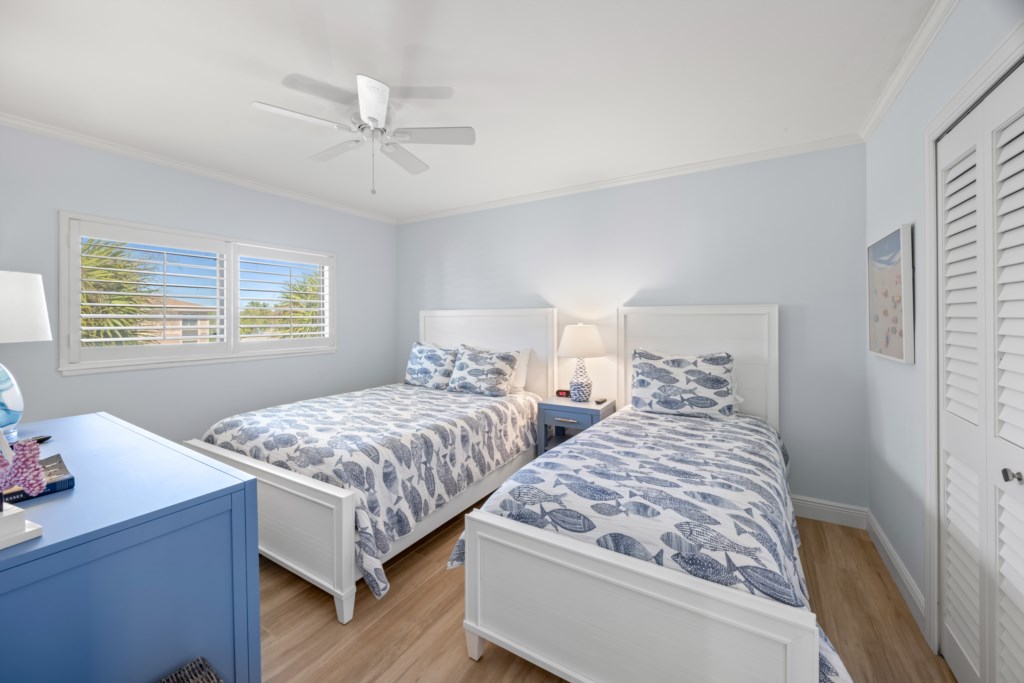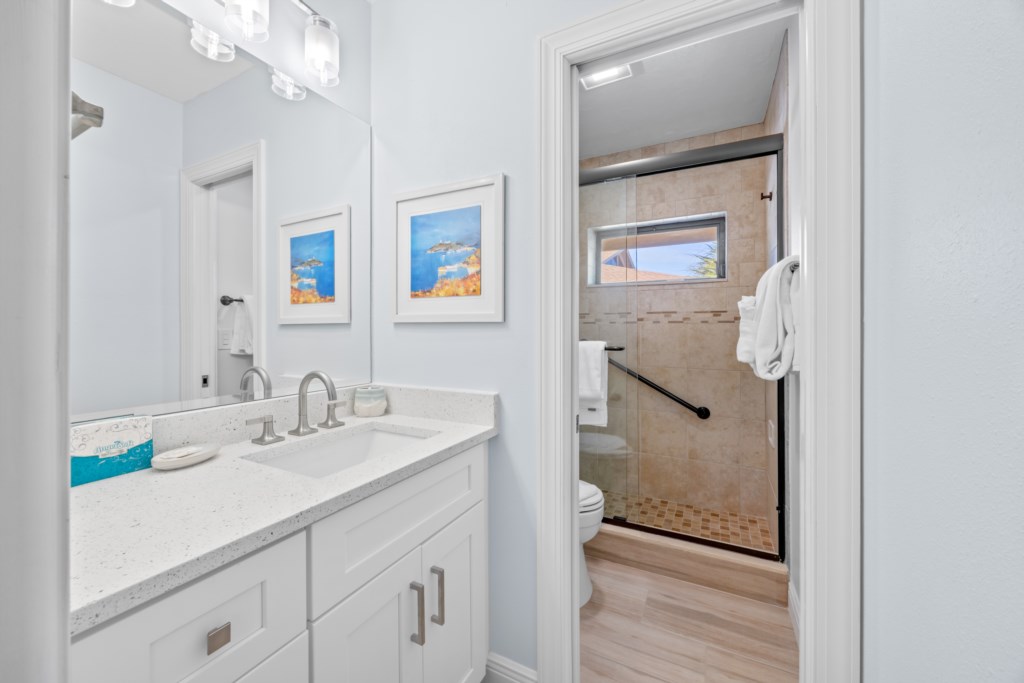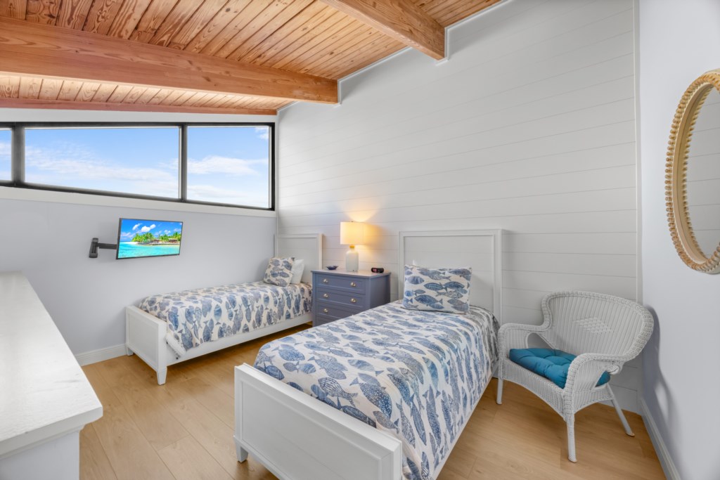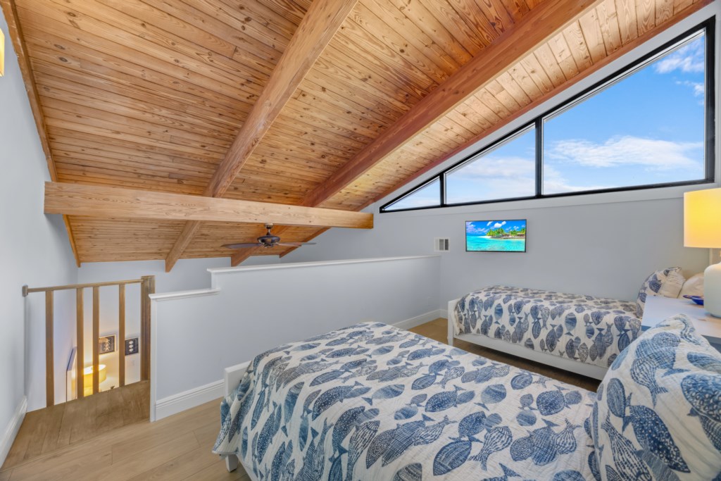 The master suite invites you to unwind with a comfortable king bed, while the en-suite bath boasts granite countertops and a glass-enclosed tiled shower. The guest bedroom is bright and cheerful with a queen and twin bed, and a beautifully tiled shower/tub combo. Upstairs, the loft with two twin beds offers a cozy hideaway with charming views—perfect for kids or extra guests.
