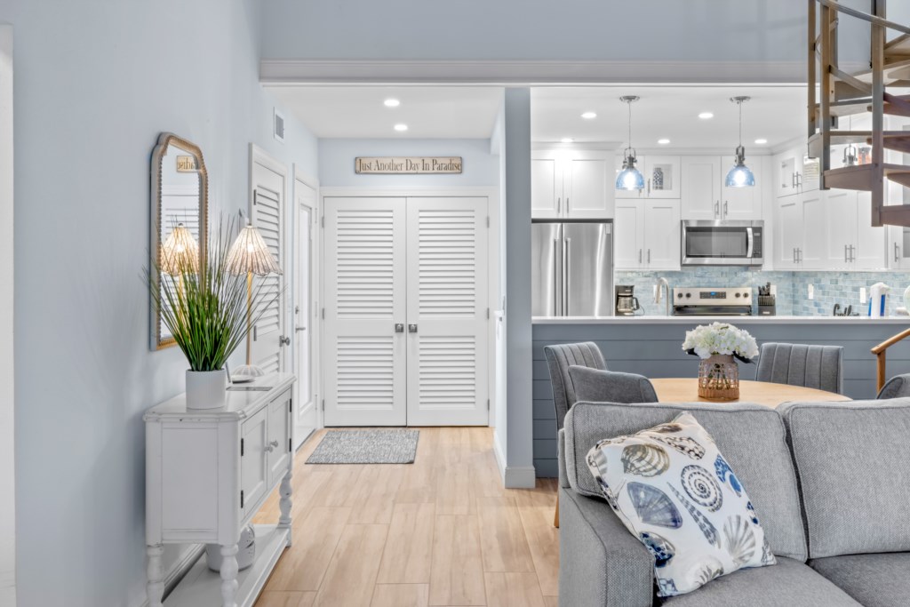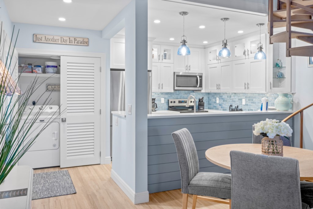 The kitchen is a chef’s dream, featuring stainless steel appliances, granite countertops, clean white cabinets, and a built-in bar—perfect for crafting meals or heating up takeout from Sanibel’s fantastic restaurants. The dining area and large living room offer plenty of space to gather, relax, and enjoy time together. Step out onto your private screened lanai and soak in the tropical landscaping while listening to the gentle sounds of the waves.