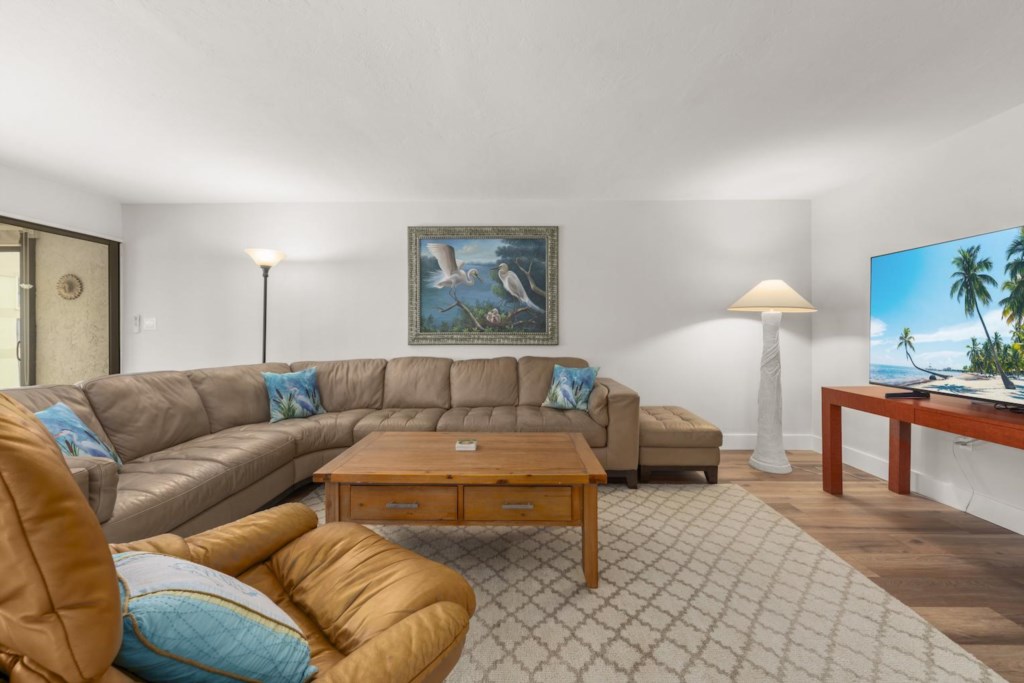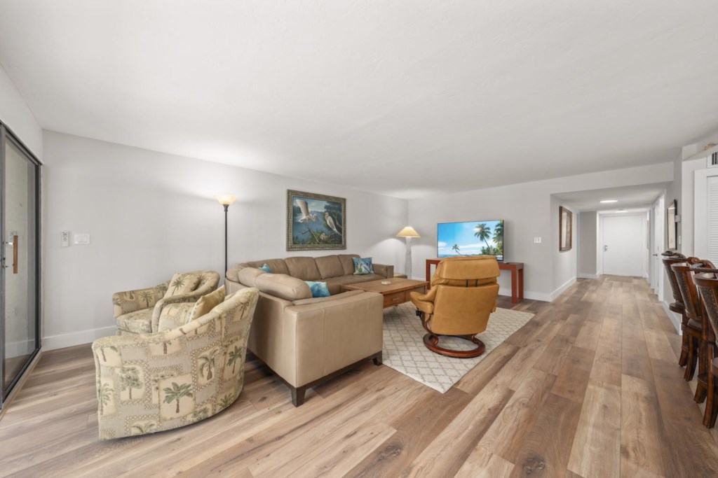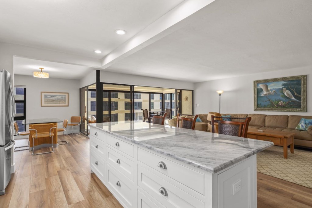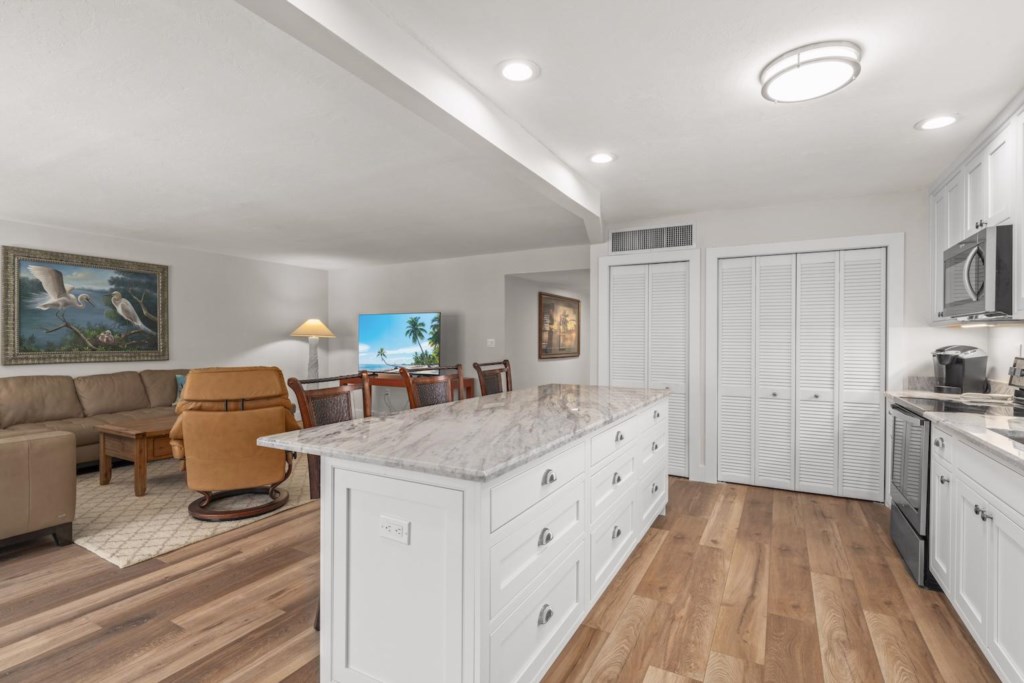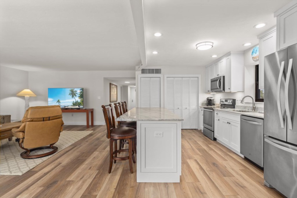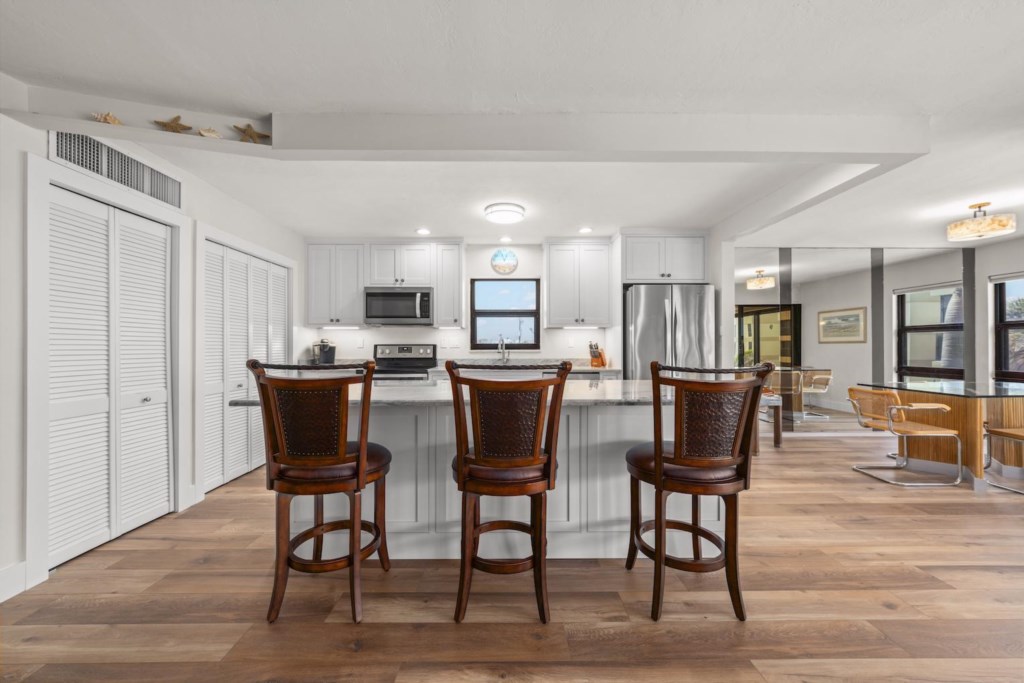 The open floor plan allows the kitchen, dining area, and living room to flow together effortlessly, creating an inviting coastal atmosphere that feels bright, relaxed, and easy. Whether you’re preparing a casual breakfast or winding down after a beach-filled day, the space feels connected and comfortable.