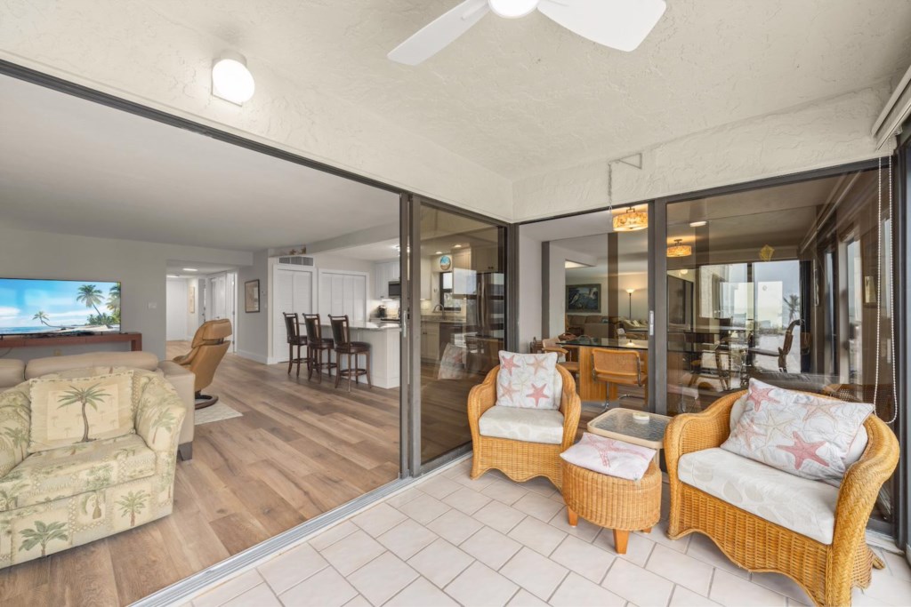From the moment you step inside, natural light pours through the open living spaces, drawing your eye straight to the Gulf beyond. The glass-enclosed lanai becomes your front-row seat to the sea — a peaceful spot for slow mornings with coffee, breezy afternoons lost in a book, and unforgettable sunsets that paint the sky in soft pastels year-round.