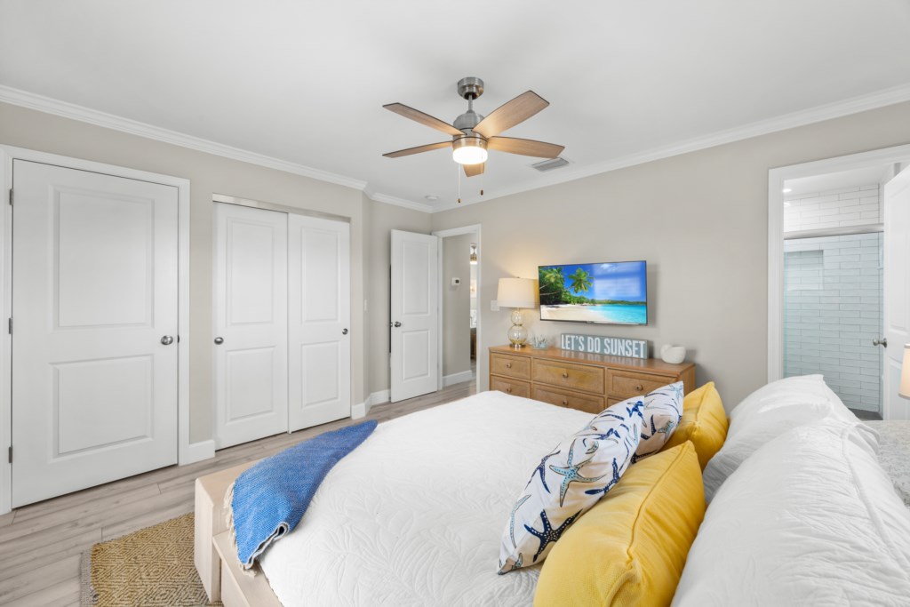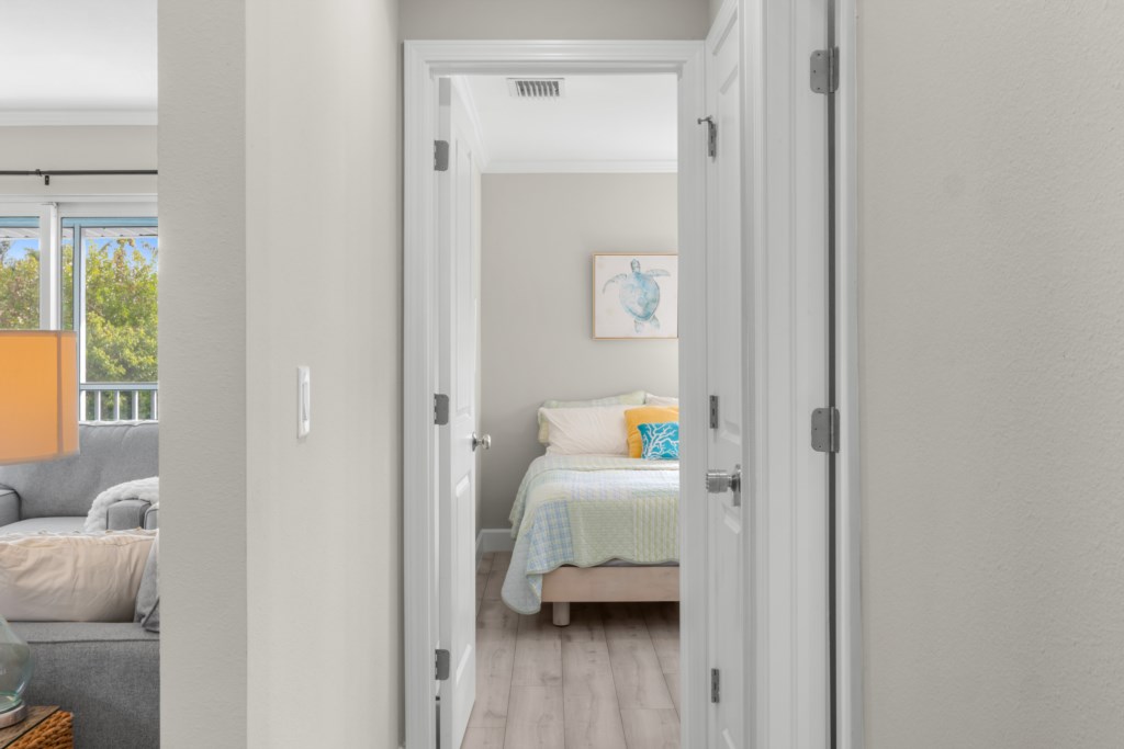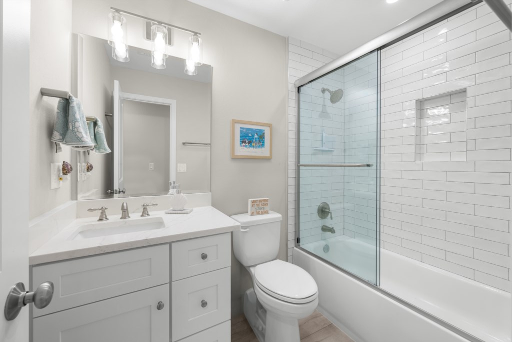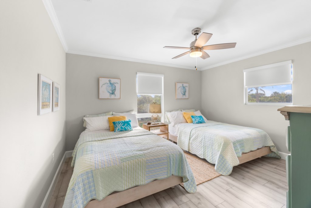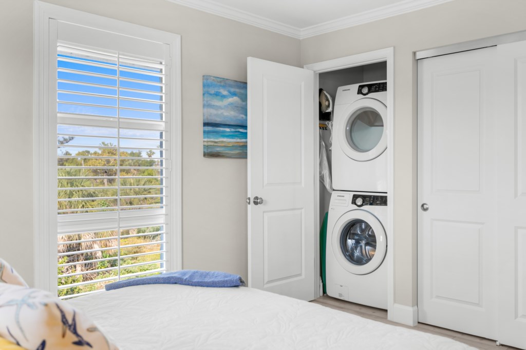 Sleeping accommodations include a queen bed in the primary suite and two double beds in the guest room, comfortably hosting your group. The condo has been fully remodeled with beautiful coastal décor and thoughtful updates throughout. You’ll also enjoy the convenience of an in-unit washer and dryer.